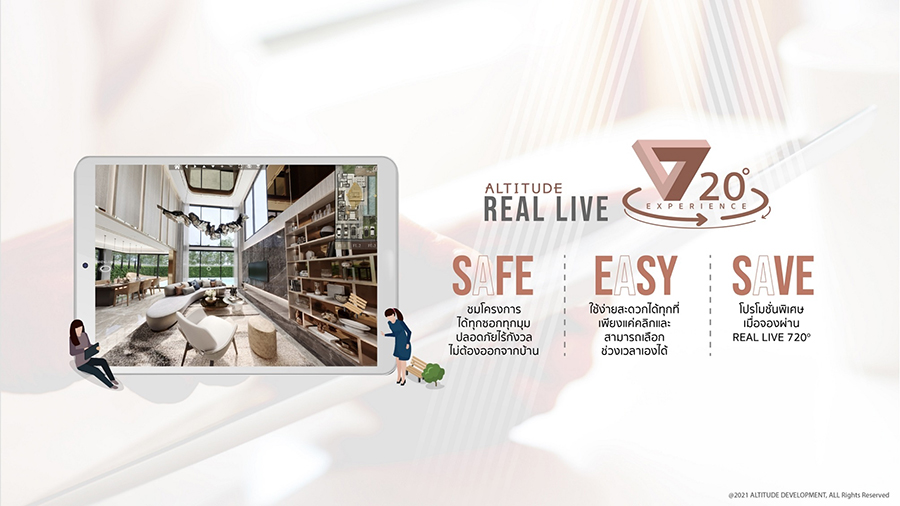 นอกจากนั้น เพื่อตอบรับสถานการณ์ในปัจจุบันที่โลกเกิดวิกฤตการระบาดของไวรัสตั้งแต่ปีที่ผ่านมา อัลติจูดได้ปรับกลยุทธ์การขายวิถีใหม่ ‘REAL LIVE 720 DEGREE’ หรือ นวัตกรรมเรียลไลฟ์ 720 องศา ภายใต้แนวคิด ANYONE CAN BUY ANYWHERE & ANYTIME ซึ่งเป็นนวัตกรรมเยี่ยมชมโครงการที่สามารถสัมผัสประสบการณ์เสมือนจริง 720 องศา ทั้งการชมบ้านตัวอย่าง ชมส่วนกลางเสมือนจริงได้รอบทิศทาง และสามารถทำ POP UP SPACE ออกแบบบ้านตามไลฟ์สไตล์ที่ชอบด้วยตัวเอง นับเป็นการสร้างปรากฏการณ์ใหม่ของรูปแบบการขายให้ลูกค้าได้สัมผัสประสบการณ์ที่เหนือกว่าของการซื้อที่อยู่อาศัย