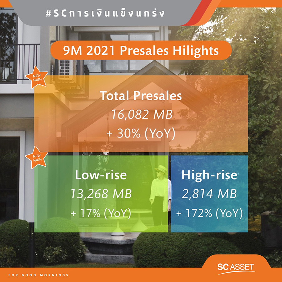 นายอรรถพล สฤษฎิพันธาวาทย์ ประธานเจ้าหน้าที่ด้านสนับสนุนองค์กร บริษัท เอสซี แอสเสท คอร์ปอเรชั่น จำกัด (มหาชน) หรือ SC เปิดเผยผลการดำเนินงานในรอบ 9 เดือนที่ผ่านมาว่า “ด้วยพอร์ตแนวราบที่แข็งแกร่ง ส่งผลให้การดำเนินงานของบริษัทเติบโตทำนิวไฮ ทั้งยอดขายรวมและยอดขายแนวราบ รวมถึงรายได้จากโครงการแนวราบ ซึ่งมาจากปัจจัยหลัก คือ ความเชื่อมั่นในแบรนด์ SC และการส่งมอบสินค้าและบริการคุณภาพมาตรฐานสูงที่ทำให้มีการตอบรับที่ดีในทุกระดับราคา ส่งผลให้บริษัทมียอดขายรวม 16,082 ล้านบาท เติบโต 30% (YoY) โดยสัดส่วนหลักกว่า 80% มาจากยอดขายแนวราบ 13,268 ล้านบาท เติบโต 17% (YoY) และเป็นสถิติยอดขายสูงสุดของ 9 เดือน ซึ่งกลุ่มสินค้าหลัก ได้แก่ บ้านราคามากกว่า 10 ล้านบาทขึ้นไป เติบโต 37% (YoY) และมียอดขายแนวสูง 2,814 ล้านบาท เติบโต 172% (YoY)