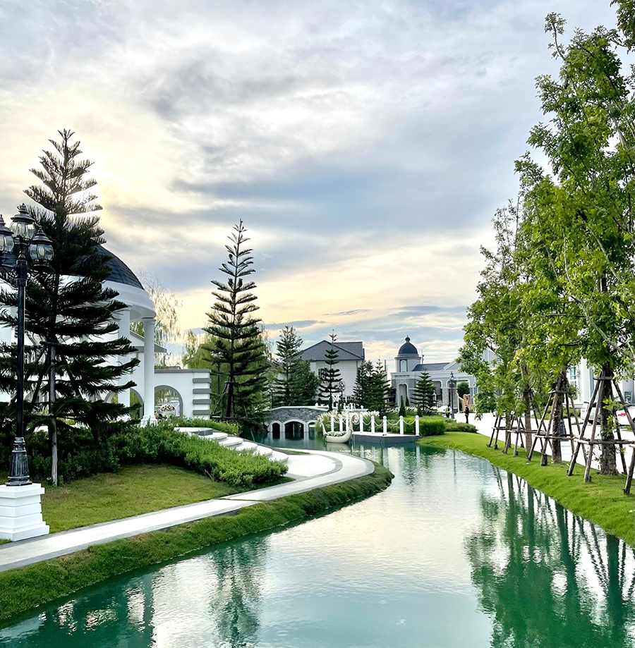 สร้างบรรยากาศให้เหมือนอยู่บ้านท่ามกลางสวนสวยในประเทศอังกฤษ โดยได้แรงบันดาลใจมาจาก Stourhead Gardens และ Kensington Gardens พร้อมด้วยประติมากรรมและน้ำพุ ตกแต่งอย่างงดงาม ซุ้มทางเข้าโครงการโออ่าภูมิฐานเหนือระดับโครงการบ้านหรูทั่วไป คลับเฮาส์อลังการสง่างามด้วยสถาปัตยกรรม New Art Deco มี Sport Club & Co-working Space แยกเป็นสัดส่วน พร้อมสระว่ายน้ำขนาดใหญ่