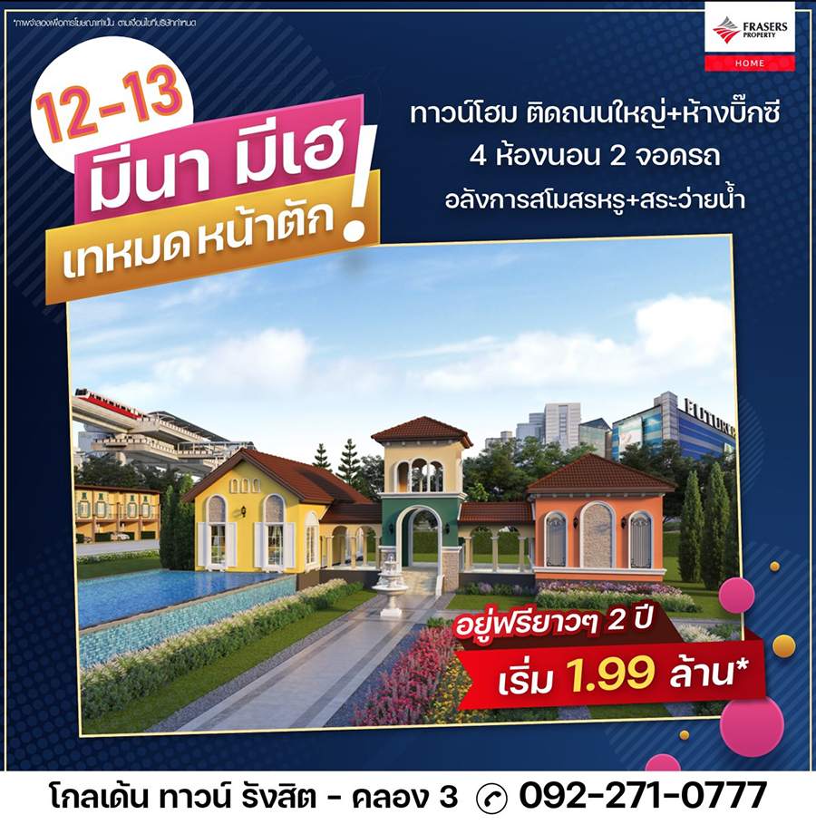 • โกลเด้น ทาวน์ รังสิต - คลอง 3 ราคาเริ่ม 1.99 ล้าน* อยู่ฟรี ยาวๆ 2 ปี*