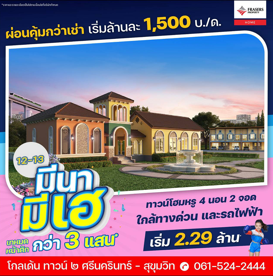 • โกลเด้น ทาวน์ ๒ ศรีนครินทร์-สุขุมวิท เริ่ม 2.29 ล้าน* ส่วนลดกว่า 300,000 บาท* ผ่อนคุ้มกว่าเช่า เริ่มเพียง ล้านละ 1,500 บาท*/เดือน