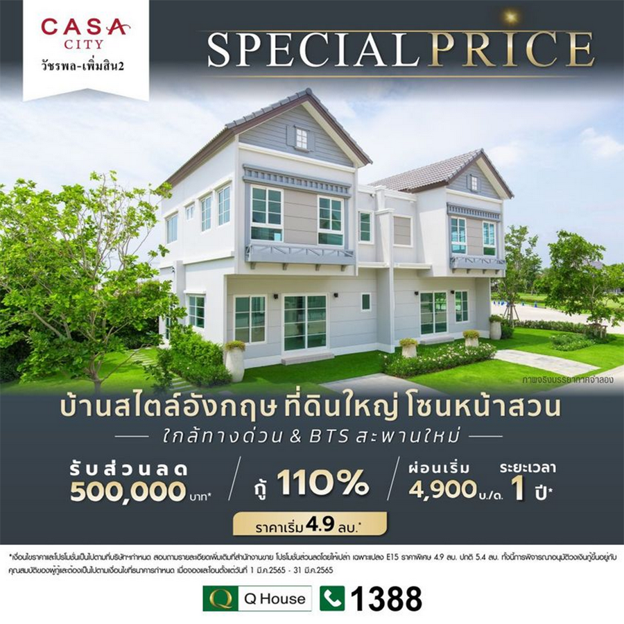 คาซ่า ซิตี้ วัชรพล-เพิ่มสิน 2 บ้านสไตล์อังกฤษ โซนหน้าสวน SpecialPrice! แปลงใหญ่ราคาพิเศษ เริ่ม 4.9 ลบ.* พร้อมรับข้อเสนอพิเศษ