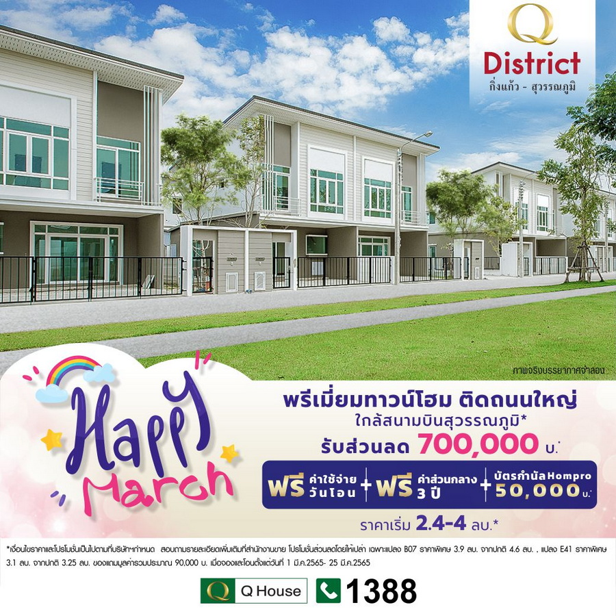 Happy March "Q District กิ่งแก้ว–สุวรรณภูมิ" พรีเมี่ยมทาวน์โฮมติดถนนใหญ่ เฟสใหม่ หน้าสวน ใกล้สนามบินสุวรรณภูมิ และแอร์พอร์ตลิงค์ สถานีลาดกระบัง ราคา 2.4 - 4 ล้านบาท* รับส่วนลด 700,000 บาท* บัตรกำนัล Homepro มูลค่า 50,000 บาท* ลงทะเบียนรับเพิ่มฟรี 4 รายการ*
