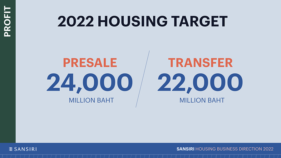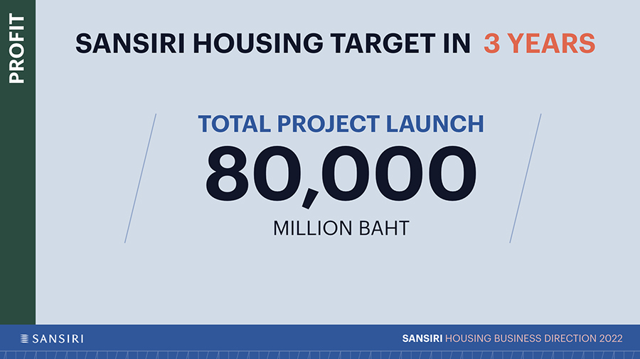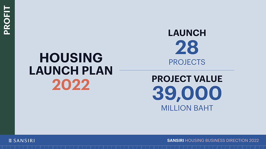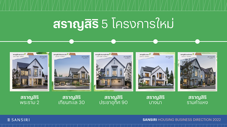 สำหรับแผนธุรกิจในการพัฒนาโครงการแนวราบในปี 2565 แสนสิริวางแผนเปิดตัวโครงการแนวราบ รวม 28 โครงการ มูลค่ารวม 39,000 ล้านบาท รุกแนวราบในสัดส่วนถึง 75% จากแผนเปิดตัวโครงการรวมในปีนี้ โดยแบ่งเป็นบ้านเดี่ยว 11 โครงการ มิกซ์โปรดักส์ 5 โครงการ และทาวน์โฮม 12 โครงการ ครอบคลุมทุกเซกเมนต์ในสัดส่วน Affordable 45% / Medium 26% / Premium 29% โดยตั้งเป้าหมายยอดขายโครงการแนวราบในปีนี้ไว้ที่ 24,000 ล้านบาท คิดเป็น 70% จากเป้าหมายยอดขายรวมของแสนสิริ พร้อมวางเป้ายอดโอนโครงการแนวราบไว้ที่ 22,000 ล้านบาท หรือคิดเป็น 63% จากเป้าหมายยอดโอนรวมของแสนสิริ เติบโตขึ้น 20% จากยอดโอนในปีที่ผ่านมาที่ทำได้ 18,300 ล้านบาท นอกจากนี้แสนสิริยังมองถึงความแข็งแกร่งระยะยาวในช่วง 3 ปี ที่จะเติบโตอย่างยั่งยืน ด้วยแผนการเปิดตัวโครงการแนวราบมูลค่ารวม 80,000 ล้านบาท พร้อมเป้าหมายยอดขายโครงการแนวราบ 3 ปีที่ 62,000 ล้านบาท สอดคล้องแผนธุรกิจระยะยาวที่เคยประกาศไว้