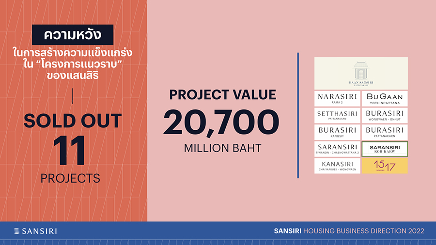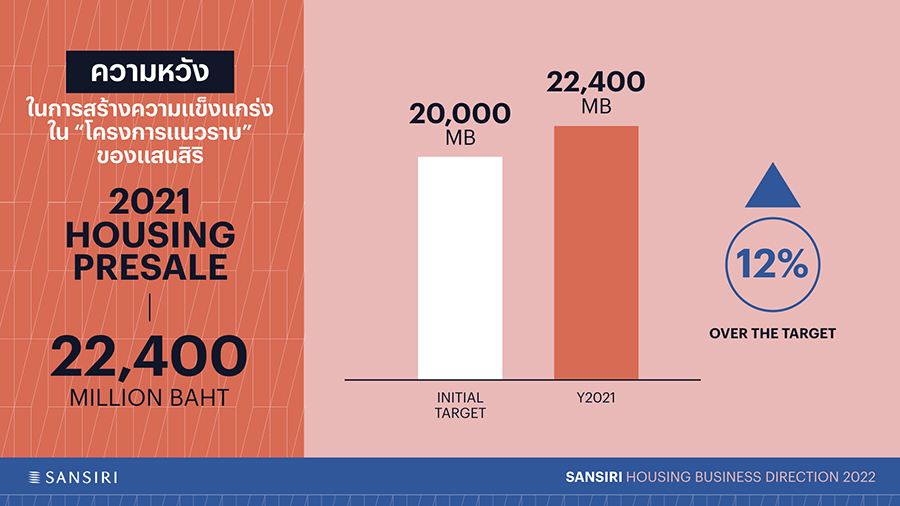 ส่งผลให้มียอดขายโครงการแนวราบทะลุเป้าไปถึง 22,400 ล้านบาท สูงกว่าเป้าหมาย 12% และโตขึ้นเกือบ 10% จากยอดขายแนวราบปีก่อน ประสบความสำเร็จ Sold out โครงการแนวราบไปถึง 11 โครงการ มูลค่ารวม 20,700 ล้านบาท โดยยอดขายแนวราบที่ทำได้คิดเป็นสัดส่วนถึง 67% จากยอดขายรวมปี 64 ขณะที่ยอดโอนโครงการแนวราบสูงกว่าเป้าหมายที่ 18,300 ล้านบาท และคิดเป็น 55% จากยอดโอนรวมปี 64 ความสำเร็จมาจากการมีโครงการแนวราบที่ตอบรับทุกความต้องการ กระจายในหลายทำเล และหลายระดับราคา ประกอบด้วย