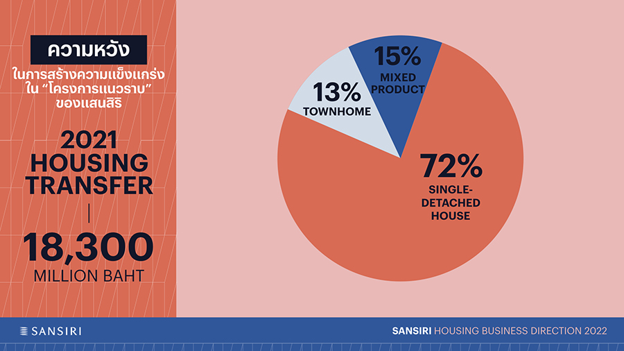 สำหรับแผนธุรกิจในการพัฒนาโครงการแนวราบในปี 2565 แสนสิริวางแผนเปิดตัวโครงการแนวราบ รวม 28 โครงการ มูลค่ารวม 39,000 ล้านบาท รุกแนวราบในสัดส่วนถึง 75% จากแผนเปิดตัวโครงการรวมในปีนี้ โดยแบ่งเป็นบ้านเดี่ยว 11 โครงการ มิกซ์โปรดักส์ 5 โครงการ และทาวน์โฮม 12 โครงการ ครอบคลุมทุกเซกเมนต์ในสัดส่วน Affordable 45% / Medium 26% / Premium 29% โดยตั้งเป้าหมายยอดขายโครงการแนวราบในปีนี้ไว้ที่ 24,000 ล้านบาท คิดเป็น 70% จากเป้าหมายยอดขายรวมของแสนสิริ พร้อมวางเป้ายอดโอนโครงการแนวราบไว้ที่ 22,000 ล้านบาท หรือคิดเป็น 63% จากเป้าหมายยอดโอนรวมของแสนสิริ เติบโตขึ้น 20% จากยอดโอนในปีที่ผ่านมาที่ทำได้ 18,300 ล้านบาท นอกจากนี้แสนสิริยังมองถึงความแข็งแกร่งระยะยาวในช่วง 3 ปี ที่จะเติบโตอย่างยั่งยืน ด้วยแผนการเปิดตัวโครงการแนวราบมูลค่ารวม 80,000 ล้านบาท พร้อมเป้าหมายยอดขายโครงการแนวราบ 3 ปีที่ 62,000 ล้านบาท สอดคล้องแผนธุรกิจระยะยาวที่เคยประกาศไว้