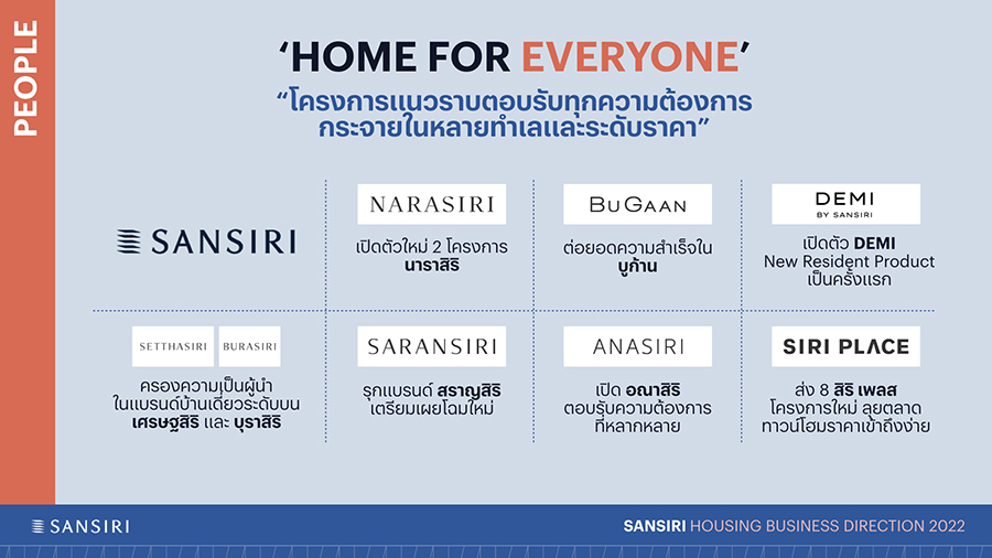 นอกจากนี้ในปี 2565 แสนสิริยังไฮไลท์การพัฒนาโครงการใหม่ภายใต้แนวคิด “YOU-Centric” แสนสิริจะนำเสนอโครงการที่คิดมาจากความต้องการของลูกค้า โดยเฉพาะในด้านดีไซน์และฟังก์ชันใหม่ของโครงการแนวราบ ที่แตกต่างจากคู่แข่ง โดยในปีนี้จะได้เห็นอย่างเต็มรูปแบบในทุกแบรนด์แนวราบ อาทิ สิริ เพลส ซีรีย์ Dream Destination ที่พร้อมเปิดตัว 3 โครงการพร้อมกันในไตรมาสแรก “สิริ เพลส พัฒนาการ - สิริ เพลส เมกาบางนา - สิริ เพลส บางนา - สุวรรณภูมิ”ภายใต้แรงบันดาลใจการออกแบบจากมหานครนิวยอร์ก และปารีส พร้อมจ่อคิวเปิดตัวเร็วๆ นี้อีก 3 โครงการ ภายใต้แรงบันดาลใจในการออกแบบจากเมืองอัมสเตอร์ดัม รวมถึงการสานต่อความสำเร็จของแบรนด์ อณาสิริ แนวคิดการอยู่อาศัย Feel Just Right “ความพอดีที่ลงตัว” เปิดตัว อณาสิริ รามคำแหง กับบ้านที่ได้รับแรงบันดาลใจจากแถบเมดิเตอร์เรเนียน พร้อมพบกับบ้านเดี่ยวหลังแรกของครอบครัว แบรนด์สราญสิริ กับภาพลักษณ์ใหม่ “WHERE THE LOVE EXPANDS” พร้อมดีไซน์ Modern Farmhouse และฟังก์ชันที่ออกแบบใหม่ทั้งหมด ครั้งแรกในวงการที่อยู่อาศัย บ้านเดี่ยวแบรนด์บุราสิริ ที่จะยกระดับภาพลักษณ์แบรนด์ จากความเป็นบ้าน บรรยากาศรีสอร์ท สู่ The Genuine Resort Living รวมถึง การพลิกโฉมดีไซน์ บ้านเดี่ยวแบรนด์เศรษฐสิริและแบรนด์บ้านเดี่ยวระดับไฮเอนด์ นาราสิริ ที่ต้องรอติดตามในปีนี้
