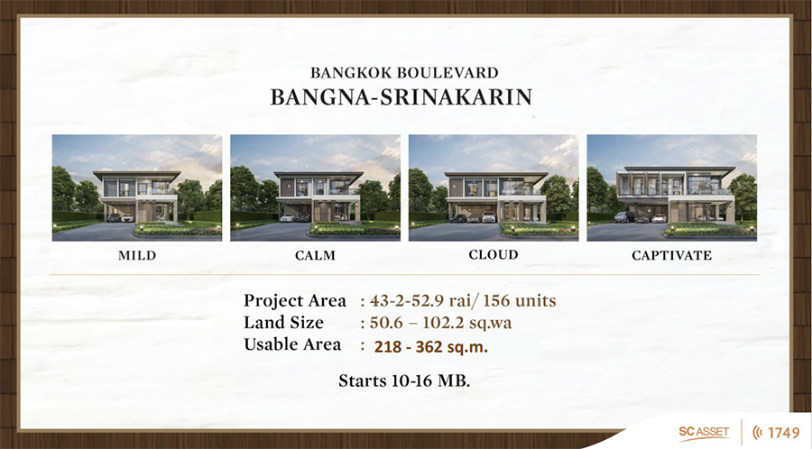 สำหรับ โครงการ บางกอก บูเลอวาร์ด บางนา-ศรีนครินทร์ อยู่บนพื้นที่กว่า 43 ไร่ จำนวน 156 ยูนิต ราคา 1 0-16 ล้านบาท มีแบบบ้าน 4 แบบ มีพื้นที่ใช้สอยตั้งแต่ 218-362 ตร.ม สำหรับส่วนกลางได้พัฒนาภายใต้คอนเซ็ปต์ Milton Abbas Village หมู่บ้านท่องเที่ยวเล็กๆในเมือง Dorset ประเทศอังกฤษ ที่ได้นำกลิ่นอายเอาจุดเด่นมาใส่ใน Clubhouse & Main Park ด้วยการเอารูปทรงของ Form มาทำให้เป็นงานออกแบบที่ Contemporary มากขึ้น