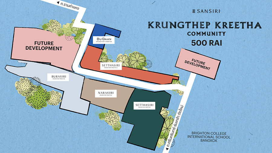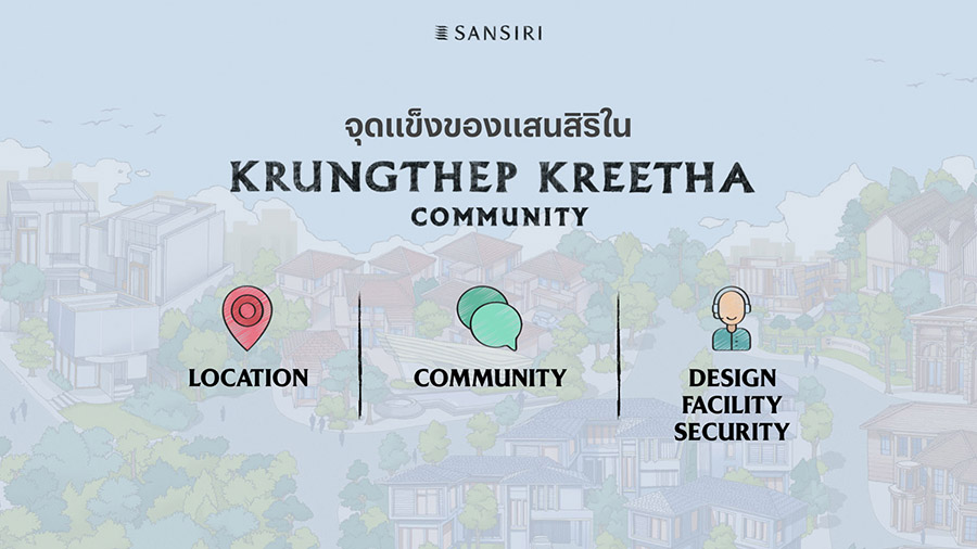 ทั้งนี้ แสนสิริเล็งเห็นว่า ทำเล “กรุงเทพกรีฑา” จะเป็นอีกหนึ่งทำเลในเมืองใหญ่ของกรุงเทพฯ ที่มีศักยภาพในการพัฒนาและเติบโตสูง จึงพัฒนา “กรุงเทพกรีฑา คอมมูนิตี้” (Krungthep Kreetha Community) รองรับการพัฒนาสังคมอยู่อาศัยประมาณ 500 ไร่ มูลค่ารวม 30,000 ล้านบาท รองรับความต้องการที่อยู่อาศัย ตลอดจนส่งมอบไลฟ์สไตล์การใช้ชีวิตที่สมบูรณ์แบบ หลังประสบความสำเร็จ ปิดการขาย 2 โครงการบ้านเดี่ยว เศรษฐสิริ กรุงเทพกรีฑาและเศรษฐสิริ กรุงเทพกรีฑา 2 ในทำเลนี้ ขนาดพื้นที่รวม 155 ไร่ มูลค่าโครงการรวม 7,500 ล้านบาท ที่ตอบโจทย์ทั้งอยู่อาศัยเองและปล่อยเช่าในคอมมูนิตี้ของชาวต่างชาติที่ทำงานในโรงเรียนนานาชาติที่อยุ่ในทำเล ทำให้ได้อัตราค่าเช่าที่ดีและสูงกว่าในทำเลอื่น