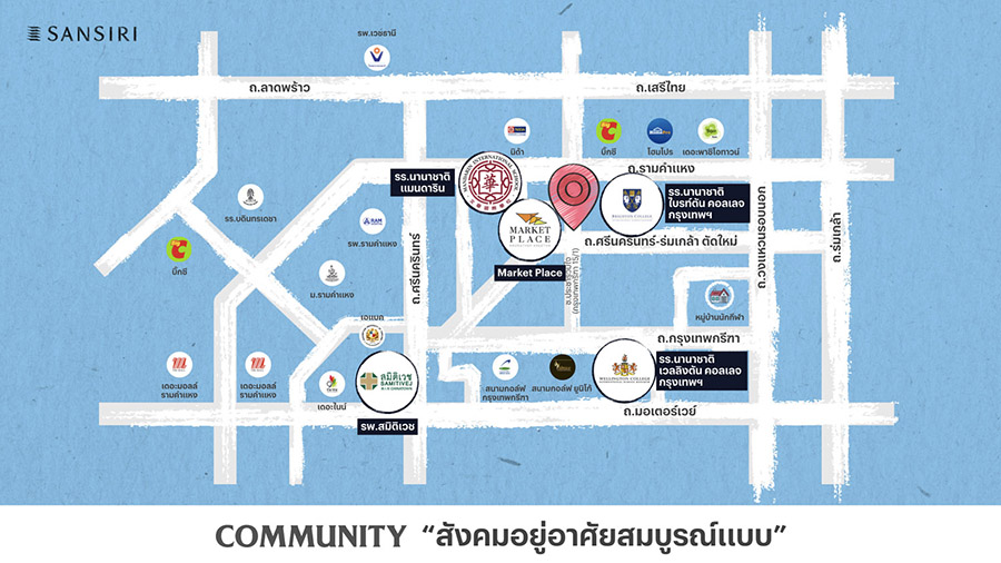 นายอาณัติ กิตติกุลเมธี รองกรรมการผู้จัดการฝ่ายพัฒนาโครงการแนวราบ บริษัท แสนสิริ จำกัด (มหาชน) กล่าวเพิ่มเติมว่า นอกจากนี้แสนสิริยังมีเพื่อนบ้าน (Neighborhood) พันธมิตรชั้นนำ ที่มาร่วมเติมเต็มให้ กรุงเทพกรีฑาคอมมูนิตี้ เป็นสังคมอยู่อาศัยสมบูรณ์แบบมากยิ่งขึ้น อาทิ โรงเรียนนานาชาติไบรท์ตัน คอลเลจ ที่อยู่ใกล้เพียง 900 เมตร โรงเรียนนานาชาติ เวลลิงตัน คอลเลจ ที่อยู่ใกล้เพียง 3.2 กิโลเมตร โรงเรียนนานาชาติ แมนดาริน ที่อยู่ใกล้เพียง 1.2 กิโลเมตร โรงพยาบาล สมิติเวช ศรีนครินทร์ เพียง 4.2 กิโลเมตร และมาร์เก็ต เพลส คอมมูนิตี้ มอลล์จากสยามฟิวเจอร์ ดีเวลลอปเมนท์ (SF) เพียง 2.5 กิโลเมตร ที่เติมเต็มไลฟ์สไตล์การใช้ชีวิต สู่การเป็นเมืองแห่งสังคมอยู่อาศัยสมบูรณ์แบบที่ดีที่สุดแห่งต่อไป พร้อมอีกหนึ่งจุดเด่นที่สำคัญ Design - Facility – Security ดีไซน์และสิ่งอำนวยความสะดวกในพื้นที่ส่วนกลางสำหรับลูกบ้านแสนสิริในทุกโครงการ อาทิ คลับเฮาส์พร้อมสระว่ายน้ำระบบเกลือ ฟิตเนส สวนส่วนกลาง สนามเด็กเล่น และ Sansiri Backyard สวนผักปลอดสาร ที่มีอยู่ในแต่ละโครงการ รวมถึงความปลอดภัยในการอยู่อาศัยที่อุ่นใจตลอด 24 ชั่วโมง ด้วย SECURITY พร้อม LIV-24 ระบบรักษาความปลอดภัยมาตรฐานแสนสิริ รวมถึงการให้ความสำคัญกับสิ่งแวดล้อมโดยรอบโครงการ อาทิ “