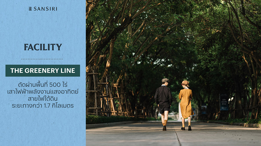 The Greenery Line” หรือ ถนนสีเขียวที่ขนาบด้วยต้นไม้ใน 2 ข้างทางพร้อมเสาไฟฟ้าพลังงานแสงอาทิตย์ และการวางระบบสายไฟลงใต้ดิน เพื่อปล่อยให้ต้นไม้ตลอดเส้นทางเติบโตได้อย่างเต็มที่ กลายเป็นถนนอุโมงค์สีเขียวชอุ่มในอนาคต ตลอดแนวระยะทางกว่า 1.7 ก.ม. ที่ตัดผ่านพื้นที่ 500 ไร่ ทะลุสู่ถนนกรุงเทพกรีฑาตัดใหม่ (ศรีนครินทร์ – ร่มเกล้า) และถนนรามคำแหงได้ในเวลาเพียง 2 นาที