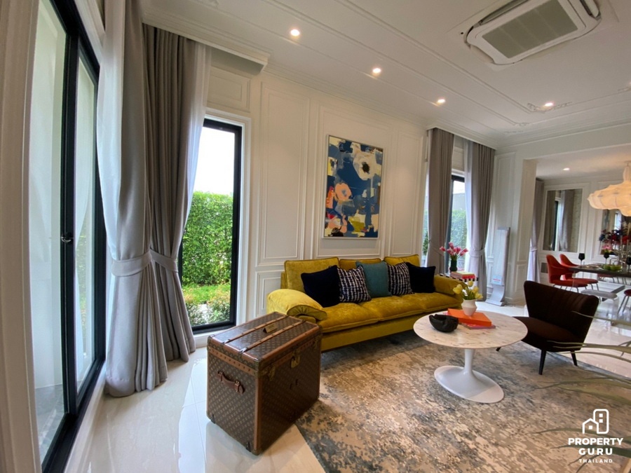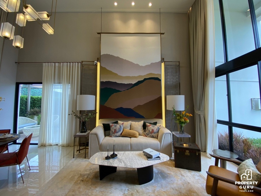 - DOUBLE VOLUME LIVING เพดานสูงกว่า 5 เมตร พร้อมกระจกบานสูง บริเวณส่วนรับแขก ในแบบบ้าน DEMI 8 ที่มีพื้นที่สำหรับทำกิจกรรมร่วมกันภายในครอบครัวใหญ่