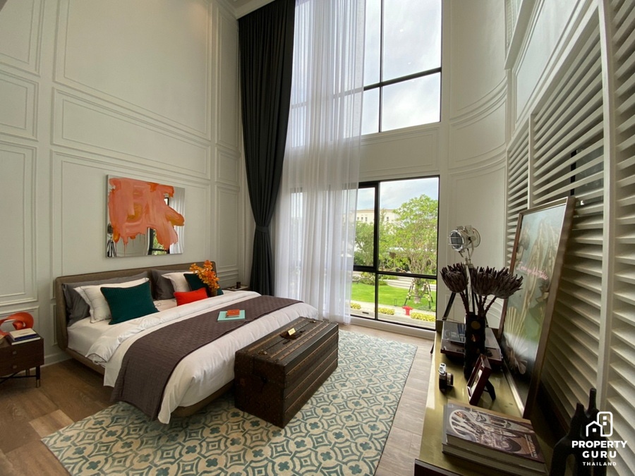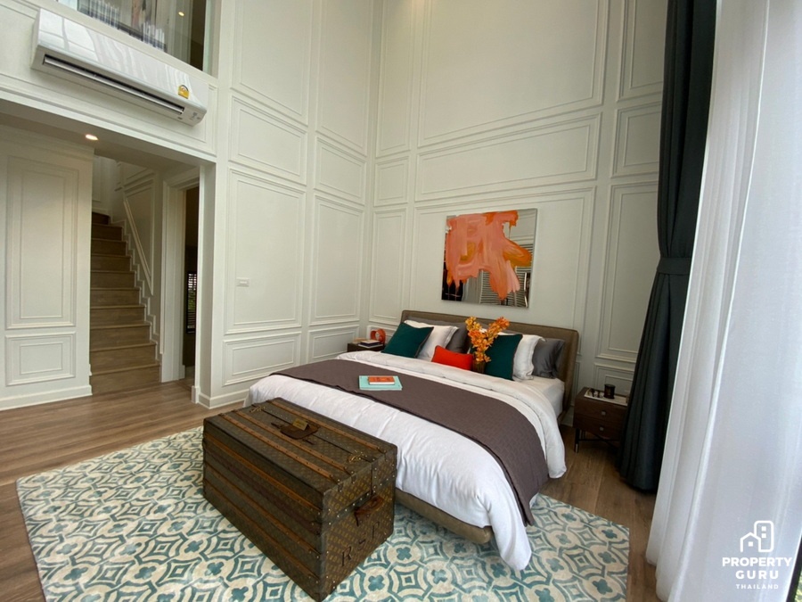 - DUPLEX MASTER BEDROOM เพดานสูงกว่า 5.65 เมตร พร้อมส่วนอเนกประสงค์ชั้นลอยภายในบริเวณห้องนอน ในแบบบ้าน DEMI 6 ซึ่งเหมือนยกรูปแบบ Duplex Condominium มาไว้ในทาวน์โฮม