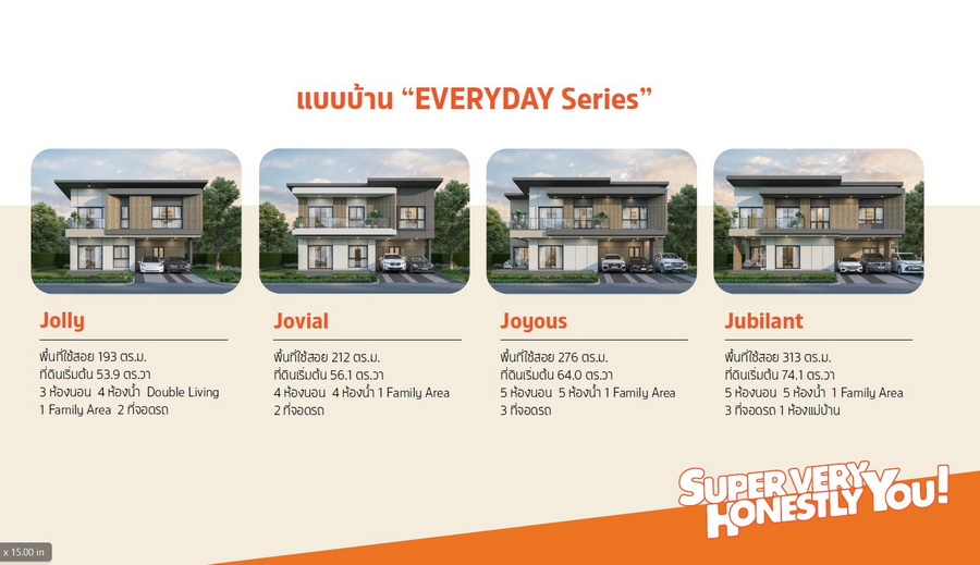 - แบบบ้าน Jovial พื้นที่ใช้สอย 212 ตร.ม. บนที่ดินเริ่มต้น 56.1 ตร.ว. ประกอบด้วย 4 ห้องนอน 4 ห้องน้ำ 1 Family Area และ 2 ที่จอดรถ