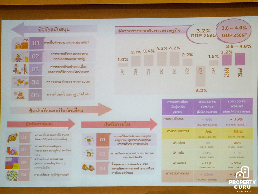 ในแง่ของเศรษฐกิจไทย ในปี 2565 ได้รับแรงส่งจากการฟื้นตัวของภาคการท่องเที่ยวภายหลังการเปิดประเทศช่วงกลางปี การขยายตัวของการบริโภคภาคเอกชนส่วนหนึ่งจากมาตรการกระตุ้นต่างๆ ของภาครัฐ และการส่งออกที่ขยายตัวได้ดีในช่วงครึ่งแรกของปี ก่อนเริ่มชะลอลงในช่วงครึ่งปีหลัง สำหรับในปี 2566 คาดว่าเศรษฐกิจโดยรวมของไทยจะขยายตัวได้ราว 3.6 – 4.0% อย่างไรก็ตามเศรษฐกิจไทยยังต้องเผชิญกับความไม่แน่นอนสูง ทั้งความไม่แน่นอนภายในประเทศและต่างประเทศ ไม่ว่าจะเป็นความเสี่ยงที่จะเกิด Recession ของเศรษฐกิจยุโรป และสหรัฐฯ ความเสี่ยงที่เกิดจากเรื่องภูมิรัฐศาสตร์ ในขณะที่กำลังซื้อภายในประเทศที่ยังอ่อนแอ ภาระหนี้ครัวเรือนและภาคธุรกิจที่อยู่ในระดับสูง ท่ามกลางแนวโน้มการเพิ่มขึ้นของภาระดอกเบี้ย ความเข้มงวดในการปล่อยสินเชื่อของธนาคารพาณิชย์ ซึ่งเป็นความท้าทายในการดำเนินธุรกิจในปี 2566 นี้ อย่างไรก็ดีภาคอสังหาริมทรัพย์มีปัจจัยสนับสนุนจากมาตรการภาครัฐ ลดค่าธรรมเนียมการโอน และค่าธรรมเนียมจำนอง สำหรับที่อยู่อาศัยที่ราคาไม่เกิน 3 ล้านบาท ถึงสิ้นปี 2566 รวมถึงการฟื้นตัวของลูกค้าที่ทำงานในกลุ่มท่องเที่ยว ซึ่งก่อนหน้านี้ถูกจำกัดการเข้าถึงสินเชื่อจากธนาคารพาณิชย์