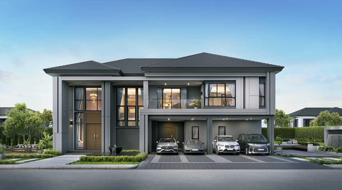 บ้านทุกหลังภายใต้ THE CITY โมเดลใหม่ ขนาดที่ดินเริ่มต้น 100 ตารางวา บ้านเดี่ยว 2 ชั้น พื้นที่ใช้สอย 386 – 580 ตารางเมตร นอกจากความเป็นเอกลักษณ์ด้วยสไตล์การออกแบบที่ Customized พิเศษเฉพาะแต่ละแปลงที่ดินแล้ว รวมถึงการเพิ่มคุณค่าในมิติสเปซฟังก์ชันรองรับทั้งความเป็นส่วนตัวและการใช้ชีวิตจริงที่พร้อมเชื่อมต่อความสัมพันธ์ของทุกคนในครอบครัว พื้นที่ชั้นหนึ่งทั้งหมดถูกจัดสรรตอบโจทย์การใช้งานร่วมกันของสมาชิกทุกคน โดยเฉพาะผู้สูงวัยและเด็กเล็ก เปิดสู่ตัวบ้านด้วย โถงเข้าบ้านพร้อมพื้นที่รับแขกขนาดใหญ่แบบ Double Volume เพดานสูงถึง 6.5 เมตร เปิดรับแสงธรรมชาติเข้าสู่ภายในด้วยกระจกบานกว้างแบบ Full Height บริเวณห้องนั่งเล่นของครอบครัว (Double Family Living) ดีไซน์แยกส่วนชัดเจนทั้งชั้น 1 และ ชั้น 2 คงความเป็นส่วนตัวสูงสุด มั่นใจทุกความปลอดภัยด้วยการดีไซน์ทางลาดรองรับการใช้งานของวีลแชร์ พร้อมห้องนอนชั้นล่างแบบ Universal Design และห้องน้ำในตัวที่ออกแบบมาโดยเฉพาะ ส่วนรับประทานอาหารสามารถรองรับตั้งแต่การใช้งาน 10 ที่นั่งขึ้นไป เชื่อมต่อกับ Pantry และห้องครัว