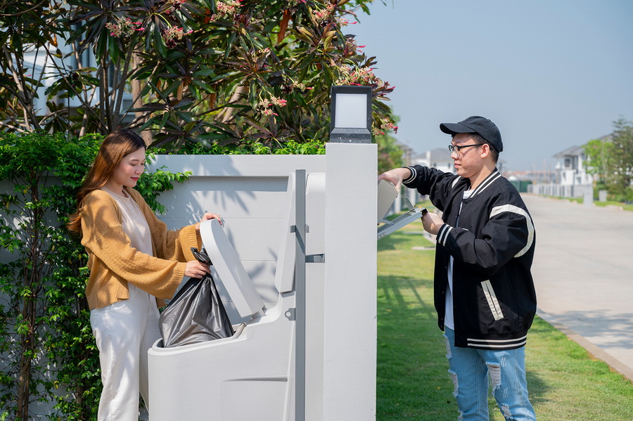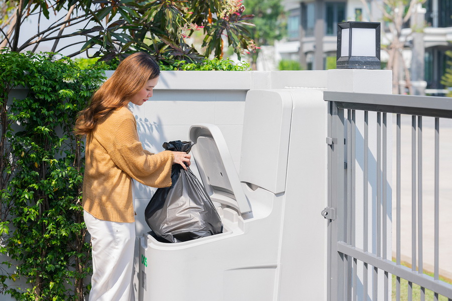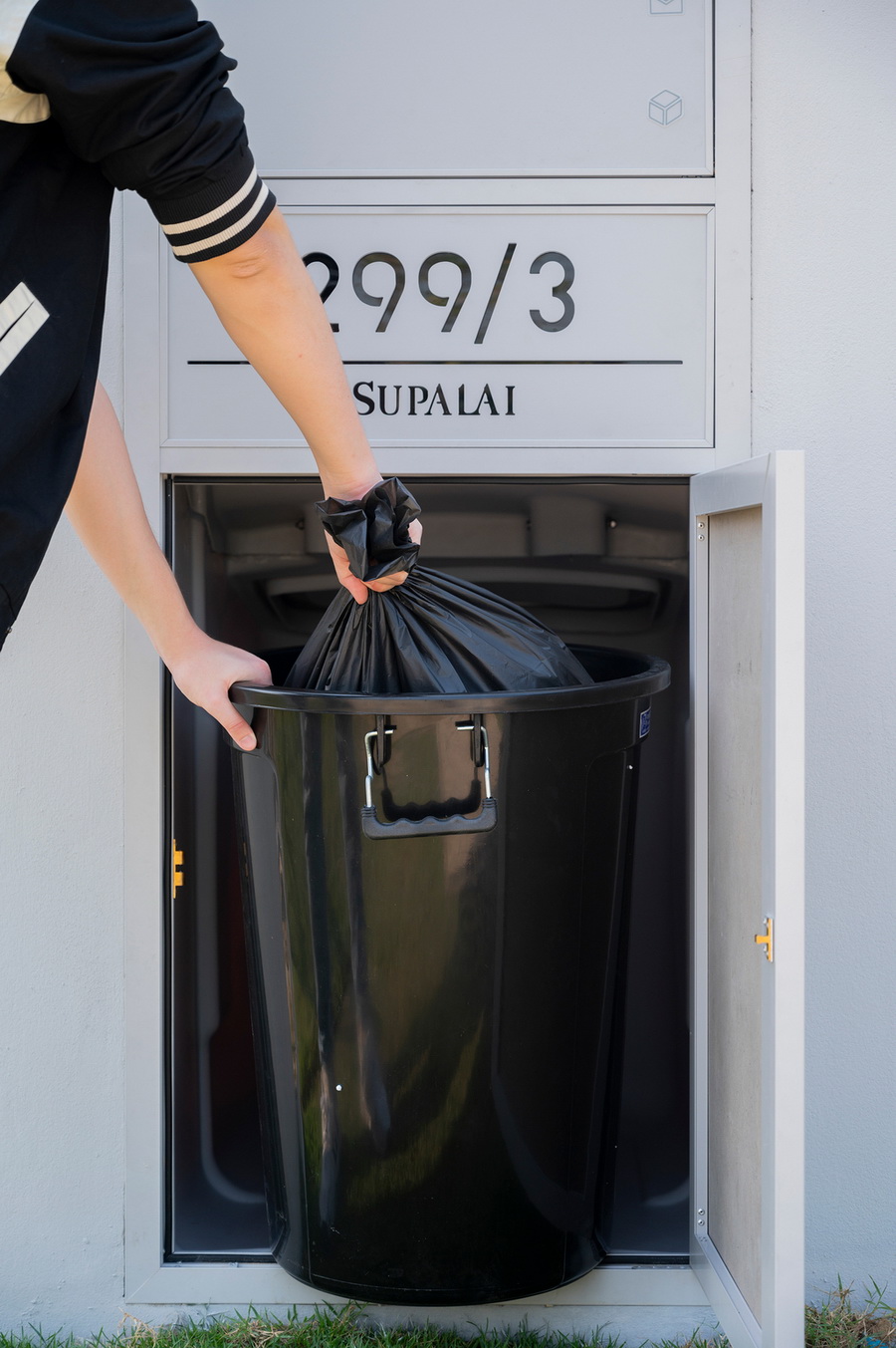 • ช่องด้านล่าง (Bin Box) ถูกออกแบบเป็นช่องขนาดใหญ่ ภายในบรรจุถังขยะขนาดมาตรฐาน ความจุ 60 ลิตร มีฝาบานเปิดด้านนอก-ด้านใน สามารถทิ้งขยะจากภายในบ้านโดยไม่ต้องออกมานอกรั้ว หมดห่วงเรื่องความสกปรกหน้าบ้านหรือกลิ่นรบกวน ทำความสะอาดง่าย ไม่เป็นแหล่งเพาะพันธุ์ ของสัตว์นำโรค สะดวกต่อการจัดเก็บขยะจากภายนอก ให้ความเป็นส่วนตัวต่อผู้อยู่อาศัยในบ้าน