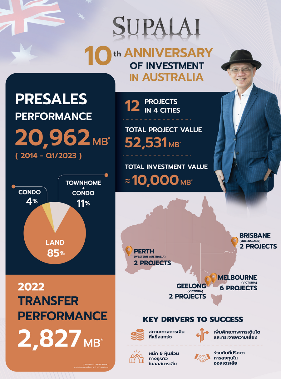 บมจ.ศุภาลัย โชว์ศักยภาพการลงทุนในออสเตรเลีย ครบรอบ 10 ปี สร้างปรากฏการณ์ยอดขายรวมจาก 12 โครงการ ตามสัดส่วนการถือหุ้นของศุภาลัย เป็นมูลค่า 894 ล้านดอลลาร์ออสเตรเลีย หรือเทียบเท่า 20,962 ล้านบาท เนื่องจากการผนึกกำลังร่วมลงทุนและบริหารงานกับ 6 หุ้นส่วนทางธุรกิจ และที่ปรึกษาการลงทุนของศุภาลัยในประเทศออสเตรเลีย ด้วยเหตุผลหลักที่มีสถานะทางการเงินที่แข็งแกร่ง และต้นทุนการเงินต่ำ จึงพร้อมขยายการลงทุนอสังหาริมทรัพย์ในต่างประเทศได้เพิ่มอีกต่อเนื่อง