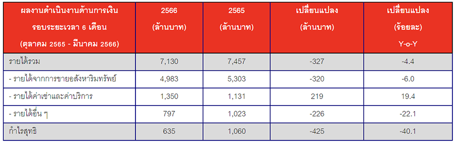 ผลการดำเนินงานรอบ 6 เดือนของปีงบประมาณ 2566 (ตุลาคม 2565 - มีนาคม 2566) มีรายได้รวมอยู่ที่ 7,130 ล้านบาท กำไรสุทธิ 635 ล้านบาท ขณะที่ผลการดำเนินงานไตรมาส 2 ของปีงบประมาณ 2566 (มกราคม - มีนาคม 2566) มีรายได้รวม 3,424 ล้านบาท กำไรสุทธิ 318 ล้านบาท โดยธุรกิจเติบโตตามแผนงานที่วางไว้ในการบาลานซ์พอร์ตโฟลิโอทั้งรายได้จากการขายอสังหาริมทรัพย์ และกระแสรายได้จากค่าเช่าที่มีสัดส่วนเพิ่มขึ้น ซึ่งสร้างสมดุลให้ธุรกิจเติบโตอย่างยั่งยืน