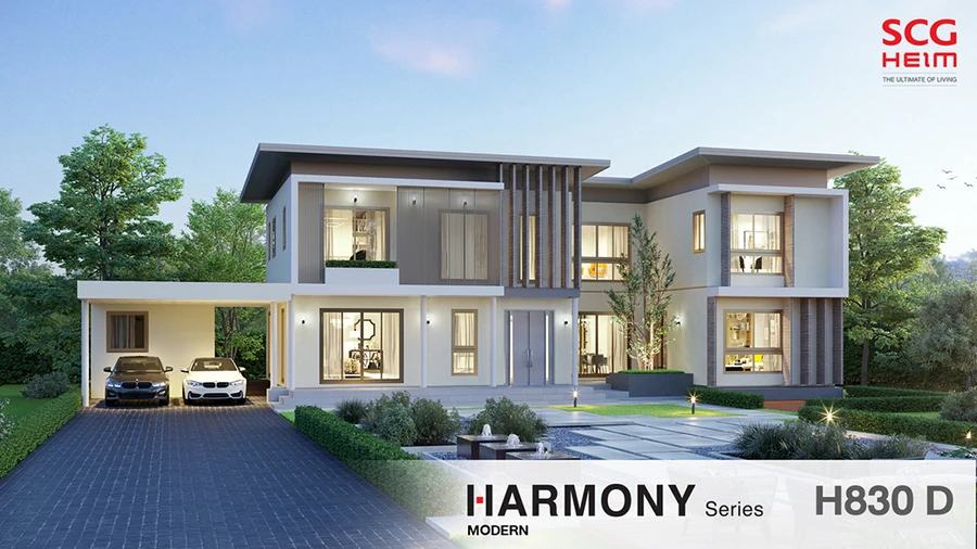 5 ห้องน้ำ เรียบหรู ทันสมัย ด้วยผนังสีงาช้าง (Ivory) ตกแต่งด้วย Facade อลูมิเนียมสีแชมเปญ พื้นที่อเนกประสงค์สำหรับทุกคนในครอบครัวได้ร่วมสังสรรค์กันได้ที่ชั้น 1 และแฟมิลี่ รูม ที่บริเวณชั้น 2 รวมทั้งห้องผู้สูงวัยอยู่ชั้นล่าง พร้อมที่จอดรถ 4 คัน, MODERN H 830 D พื้นที่ใช้สอย 329 ตร.ม. 4 ห้องนอน 5 ห้องน้ำ เหมาะสำหรับครอบครัวขนาดกลาง และพื้นที่ส่วนกลางในบ้านบริเวณชั้น 1 พร้อมด้วยห้องนั่งเล่นภายในบ้านที่มีขนาดใหญ่เชื่อมต่อกับพื้นที่ Semi-outdoor เปิดมุมมองรับสวนสวย พร้อมที่จอดรถ 3 คัน