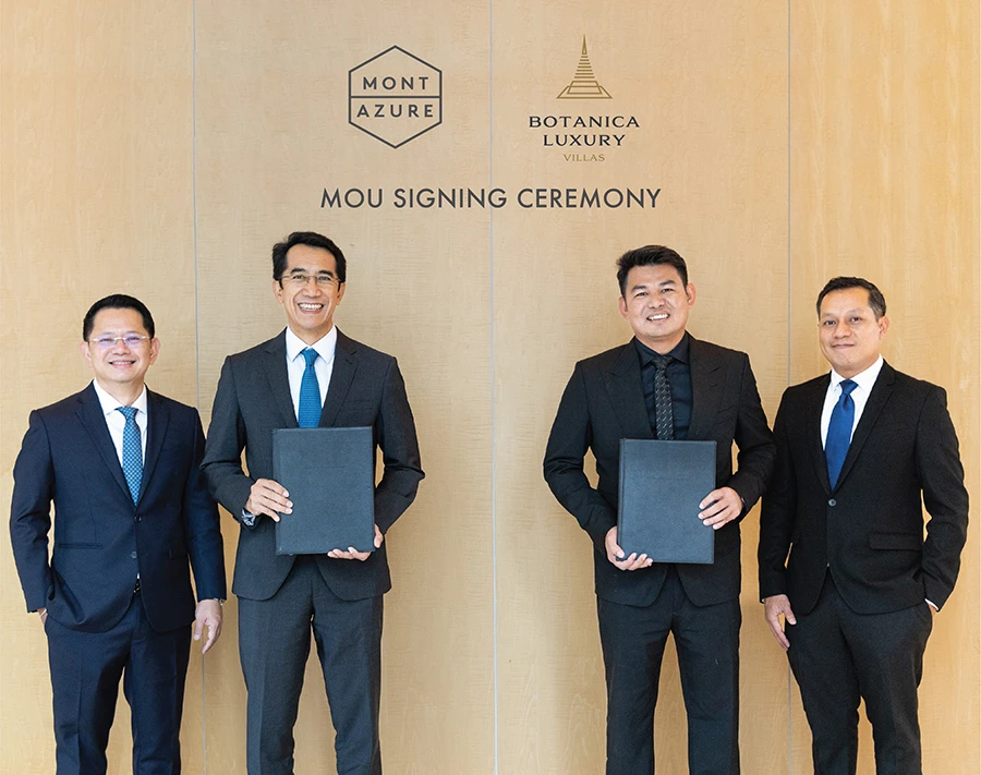 มอนท์เอซัวร์ (MontAzure) ภูเก็ต อาณาจักรมิกซ์ยูสซูเปอร์ไฮเอนด์บนทำเลสุดพิเศษของเกาะภูเก็ต “หาดกมลา” นำโดย มร. โจนาธาน อูมาลิ (ที่ 2 จากซ้าย) กรรมการบริหาร มอนท์เอซัวร์ และนายเศรษฐพล บุตรโท (ซ้าย) กรรมการบริหาร มอนท์เอซัวร์ ลงนามบันทึกความร่วมมือ (MOU) กับโบทานิก้า ลักซูรี่ วิลล่า (Botanica Luxury Villas)