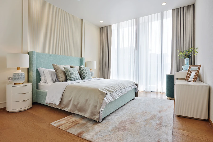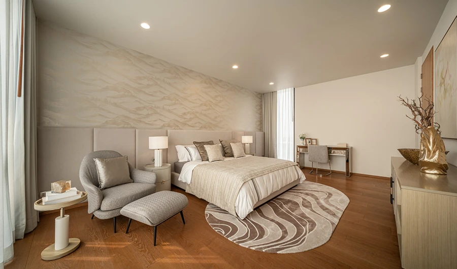 ในส่วนของห้องนอนแบ่งเป็น Junior Master Bedroom ซึ่งอยู่ชั้นเดียวกันกับ Family Room เปรียบเสมือนเป็น Penthouse ของครอบครัว การออกแบบห้องนี้จึงมีความเป็น Contemporary ที่ออกไปทาง Masculine ดังนั้นจึงมีการเลือกใช้สีภายในห้องนอนให้ดูมีความสดใสมาตัดกับสีดำ