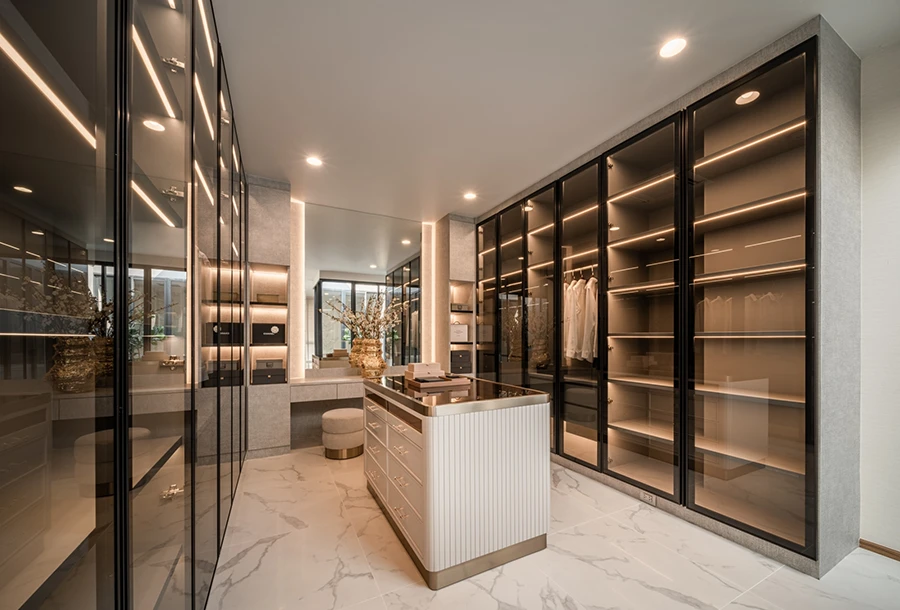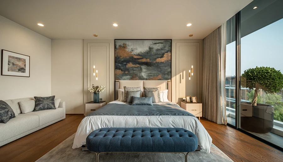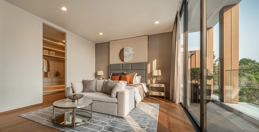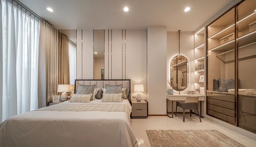 บริเวณ Foyer ที่เดินเข้ามามีการนำ Artwork จากแบรนด์ Leftbank Art มาตกแต่ง นอกจากนี้ในส่วนของบริเวณหัวเตียงกรุเป็นเหมือนผนังที่เต็มทั้งผนัง แต่ยังมีฟังก์ชั่นที่บานประตูขวาของเตียงให้สามารถสไลด์ออกเพื่อให้แสงสว่างเข้าได้อีกด้วย ขณะที่ Walk-in closet ของห้องนี้มีการนำประตูบานเลื่อนที่หน้าบานกระจกมี Texture พิเศษที่ช่วยทำให้ห้องดูโปร่ง