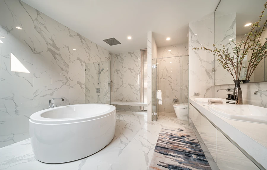 ชั้น 1 ในส่วนของโซน Living Area ถือเป็นศูนย์รวมของสมาชิกภายในบ้านได้ทำกิจกรรมร่วมกัน หรือแม้แต่การที่เพื่อนๆ แวะเวียนมาพบปะสังสรรค์ ดังนั้นการวาง Layout จึงให้ความสำคัญกับ Open Space ที่สามารถเชื่อมพื้นที่กันระหว่างโซน Living, Dining และ Pantry สมาชิกในครอบครัวสามารถทำกิจกรรมต่างๆ ซึ่งอยู่ในพื้นที่ใกล้กันได้อย่างมีความสุข อีกทั้งยังเป็นการสร้างความสัมพันธ์ที่ดีให้กับครอบครัว โดยในโซน Living นี้ได้มีการนำหินอ่อน Palissandro Classico สีชมพูอมน้ำตาล ลายเส้นแร่สีน้ำตาลประกายทอง มา ตกแต่งบนผนังทีวี มีการเลือกเฟอร์นิเจอร์โซฟา TIMOTHY Collection จาก แบรนด์ Meridiani นำเข้าจาก Italy เป็น Modular sofa 2 ชิ้นต่อกัน ในรูปทรงที่โปร่ง พนักพิงไม่สูงจนเกินไป ทำให้ห้องดูไม่อึดอัด สามารถเลือกขนาดได้ตามไซส์ของบ้านได้อีกด้วย อีกทั้งยังมีการจัดวาง Layout เพื่อสร้าง Space ให้มีความต่อเนื่องมายัง คอร์ตยาร์ต (COURTYARD) พื้นที่สีเขียวรอบตัวบ้านที่จัดตกแต่งในสไตล์ Western ที่เน้นความเรียบง่าย แต่หรูหรา เลือกใช้ของตกแต่งที่ไม่ต้องอาศัยงานโครงสร้าง ง่ายต่อการดูแลรักษา เพื่อสร้าง Inspiration ในการตกแต่งสวนที่สามารถนำไปใช้ได้จริง ภายในสวนจัดวางชุดโซฟา เพื่อเพิ่มพื้นที่ใช้สอยทำให้เกิดการใช้งานที่ต่อเนื่องของผู้อยู่อาศัย ใช้น้ำพุเป็นจุดดึงสายตา สร้าง Movement และความมีชีวิตชีวาให้กับวิวภายนอก