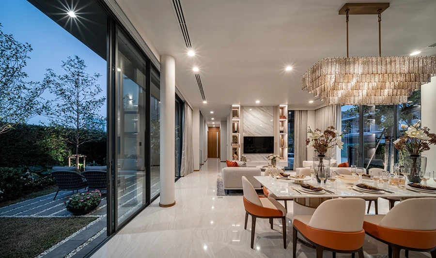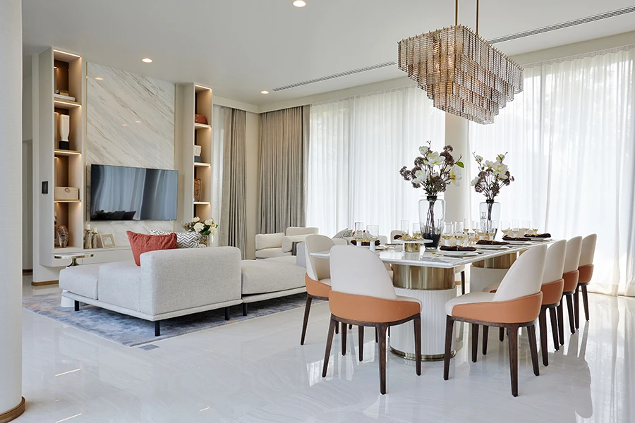 ส่วนของโซน Dining Area มีการจัดวางโต๊ะรับประทานอาหารหินอ่อนขนาดยาวเกือบ 3 เมตร มาพร้อมกับเก้าอี้หนังที่เป็นสีส้ม Amber ให้ตัดกับเฟอร์นิเจอร์สีน้ำตาลเทา ที่สีน้ำตาล และสีเทา ใช้เป็นสีของเฟอร์นิเจอร์หลักของชั้นนี้ และยังถือว่าเป็นโทนสีมาแรงของปี 2023 เพื่อสร้างจุดดึงดูดสายตา ทำให้บรรยากาศบ้านดูหรูหรา โอ่อ่า แต่ยังคงมีความสดใสซ่อนอยู่ สามารถรองรับสมาชิกภายในบ้านได้มากถึง 10 ที่นั่ง นอกจากนี้ไฮไลท์ของโซนนี้ยังประดับด้วย Sirene Smoke Glass Chandelier จากแบรนด์ Restoration Hardware นำเข้าจาก America ซึ่งมีเพียงตัวเดียวในประเทศไทย ขณะที่ในส่วนของ Pantry มีการปรับรูปแบบให้มีความแตกต่างมากขึ้นด้วยการเพิ่มเก้าอี้สตูล ปรับรูปทรงครัวไอแลนด์ เพิ่มฟังก์ชั่นการใช้งานให้เป็นเป็นมุมปาร์ตี้สังสรรค์เบาๆ ได้