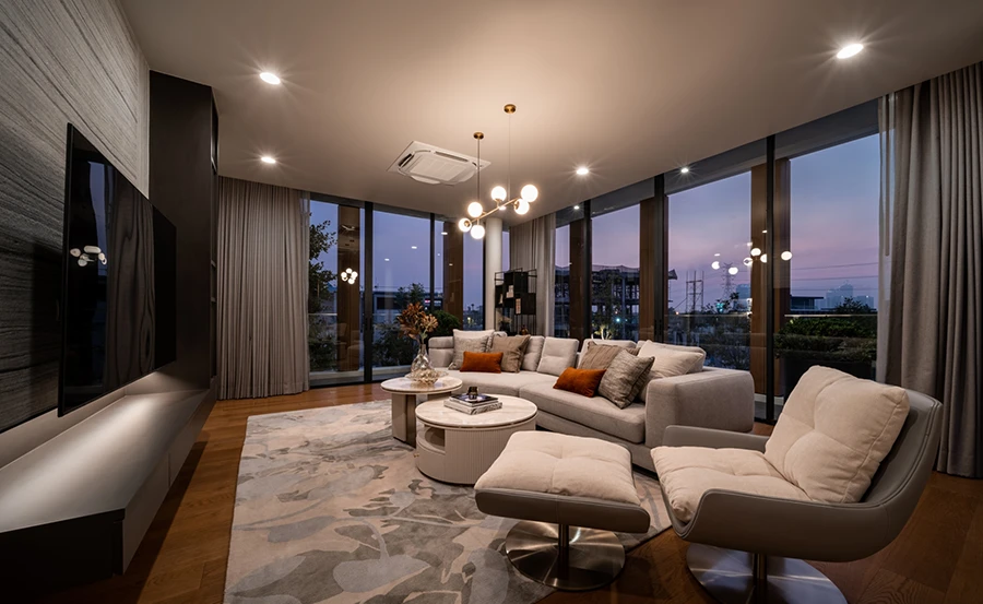 มาต่อที่ชั้น 2 แบ่งเป็น 4 ห้อง 4 ฟังก์ชั่น ประกอบด้วย Family Room, Junior Master Bedroom, Girl’s Room และ Spa Room โดยคอนเซ็ปต์ของชั้นนี้อยากตกแต่งออกมาให้เป็นชั้นของ Family เล็กๆ เป็นชั้นของครอบครัวขยาย ที่แยกออกมาอีกชั้นหนึ่ง ชั้นนี้จะมีความเป็นส่วนตัวของผู้อยู่อาศัยมากขึ้น เริ่มจากห้องแรกอย่าง Family Room เป็นห้องที่ออกแบบมาเพื่อการพักผ่อนอย่างแท้จริง มีการเลือกเฟอร์นิเจอร์ที่มีลูกเล่นของความโค้งมนทำให้ห้องนี้ดูมีความผ่อนคลาย เป็นกันเอง อีกทั้งยังวางแปลนให้มี Pantry เล็กๆ สำหรับสมาชิกในบ้านเพื่อเพิ่มความ Private โดยไม่จำเป็นต้องลงไปชั้นล่าง นอกจากนี้เองจุดเด่นของห้องยังเป็นห้องหัวมุมสามารถเห็นวิวตอนพระอาทิตย์ตกยามเย็นได้สวยงามอีกด้วย