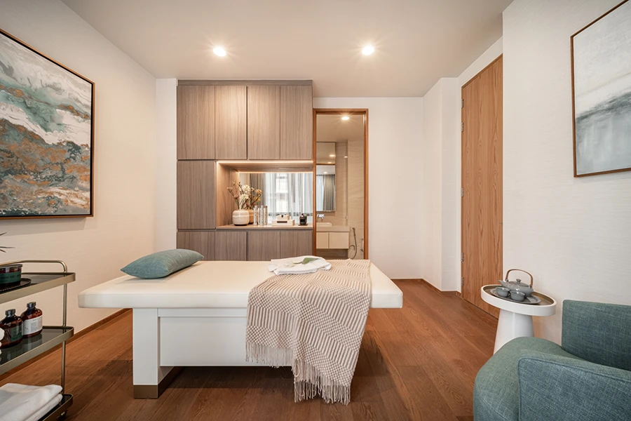 ส่วนอีกห้องที่เป็นไฮไลท์ของชั้นนี้ Spa Room เป็นการปรับฟังก์ชั่นจากห้องนอน มาเป็นห้องสปาเพื่อให้บ้านมีพื้นที่การใช้งานได้มากขึ้นนอกจากการทำเป็นห้องนอน สำหรับห้องสปานี้มีความเป็นส่วนตัว และเป็นการปรับตามเทรนด์การสร้างพื้นที่ใช้สอย หรือพื้นที่ในการทำกิจกรรมที่ผู้อยู่อาศัยไม่สะดวกที่จะออกไปทำข้างนอก ซึ่งห้องนี้มีการออกแบบให้ดูมีลูกเล่น มีการใช้สีฟ้าอมเขียว ทำให้ดูสดใส และผ่อนคลาย