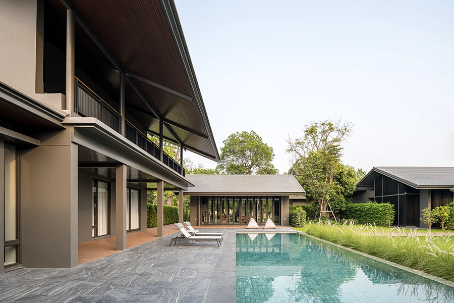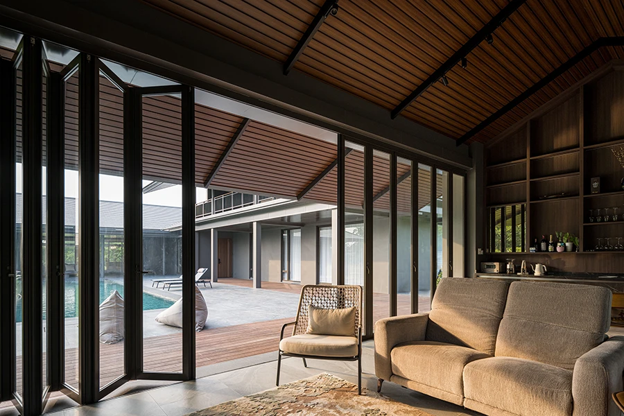 สถาปนิกผู้ออกแบบ นายสืบสาย จิตตเกษม, นายประเสริฐ อนันทยานนท์ และ ดร.ณัฏฐ์ ละเอียดอ่อน โดยออกแบบโดยคำนึงถึงการผสมผสานกับธรรมชาติและความเป็นส่วนตัวของผู้อยู่อาศัย มี Courtyard ที่เชื่อมสภาพแวดล้อมภายนอกเข้ากับภายในได้อย่างลงตัว Courtyard เหล่านี้ยังช่วยให้ลมไหลเวียนได้ดี รับแสงธรรมชาติ และมอบทิวทัศน์อันน่าหลงใหล พร้อมกับการเลือกใช้วัสดุเน้นใช้ว้สดุที่สามารถใช้ได้ทั้งภายในและภายนอกบ้านเพื่อให้เกิดความต่อเนื่องระหว่างตัวฟังก์ชั่นบ้านกับคอร์ททั้ง 4 ซึ่งวัสดุเป็นส่วนสำคัญในการสร้างบรรยากาศในงานสถาปัตยกรรม และยังสามารถสร้างความเชื่อมโยงระหว่างพื้นที่ต่างๆ ได้ด้วย โดยผลิตภัณฑ์ TOSTEM ที่นำมาใช้คือตัวสินค้า เลือกใช้หน้าต่างรุ่น ATIS เพราะตอบโจทย์เรื่องเฟรมที่บาง ทำให้บ้านกับคอร์ทดูเป็นพื้นที่เดียวกัน