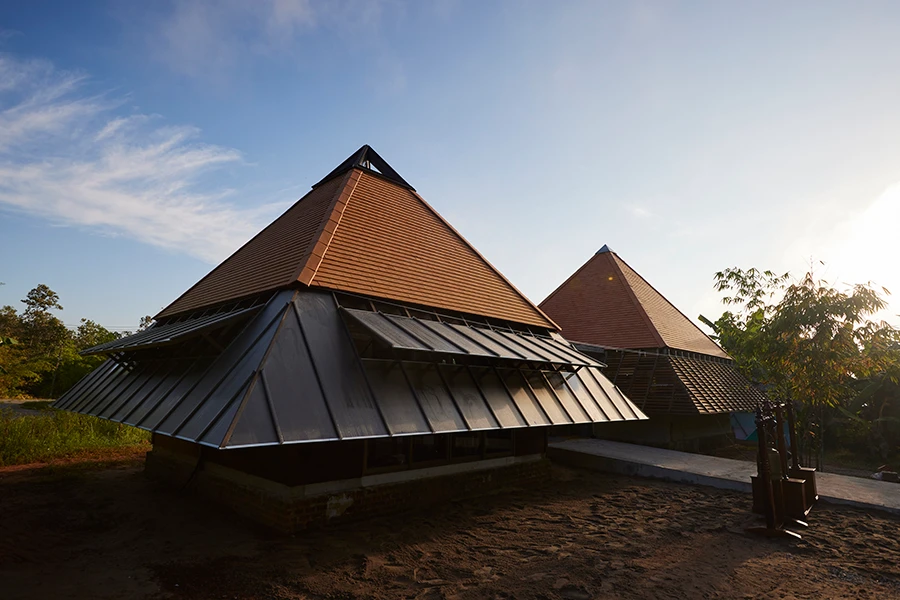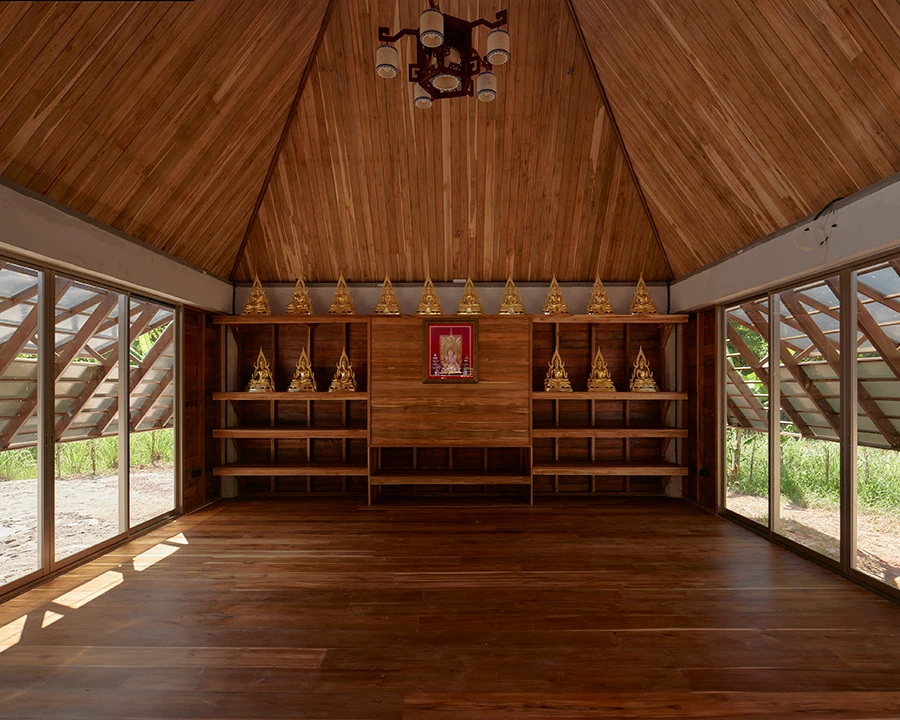 สถาปนิกผู้ออกแบบ นายภากร มหพันธ์ โดยออกแบบเป็นอาคารพีระมิด 2 หลัง เป็นโรงพยาบาลแพทย์แผนไทย วัดคำประมง จ.สกลนคร ออกแบบให้กึ่งเปิดกึ่งปิด เน้นแสงธรรมชาติ อากาศถ่ายเท มีความเป็นส่วนตัว เพื่อบำบัดผู้ป่วยมะเร็งระยะสุดท้าย โดยผลิตภัณฑ์ TOSTEM ที่นำมาใช้คือตัวสินค้า ATIS และ WE 70 ด้วยตัวผลิตภัณฑ์มีรูปแบบที่เรียบง่าย กรอบเฟรมบาง , มุ้งลวดเส้นเล็ก เหมาะกับงานไม้ได้ทัศนียภาพภายนอกเต็มเฟรม ไม่ขัดกับผิวไม้เก่าป้องกัน อากาศ , เสียง , น้ำ ได้ดี ระบายอากาศ , ความชื้น จากภายในทั้งในหน้าร้อนและหน้าฝนได้สะดวก ส่วนแนวคิดรูปแบบภายนอกของพิรามิดมีรูปทรงปิด การนำมาประยุกต์ใช้โดยให้สามารถอาศัยได้ตลอดเวลา ต้องมีการนำแสงสว่าง และ อากาศธรรมชาติจากภายนอกเข้ามา ผ่านบริเวณด้านฐานของพิรามิด ในขณะที่ส่วนตัวอาคารเป็นดินเผา ที่มีสีใกล้เคียงกับดินในบริเวณนั้น และสีจีวรของพระสงฆ์ ซึ่งเก่าและกลมกลืนไปกับสภาพธรรมชาติในบริเวณพื้นที่ปลูกสร้างอาคาร รูปแบบภายในใช้ไม้เก่าที่รื้อจาก บ้าน , วัด ในเขตภาคเหนือและภาคอีสาน มาประกอบเป็นพื้นผนังและฝ้า ซึ่งมีสีวัสดุตามธรรมชาติเดิมที่มียางไม้เคลือบตามธรรมชาติอยู่แล้ว เพื่อให้ผิวภายในสะท้อนแสงแบบ INDIRECT จากพื้นขึ้นสู่ฝ้าเพดาน คล้ายกับบ้านไม้โบราณในญี่ปุ่น