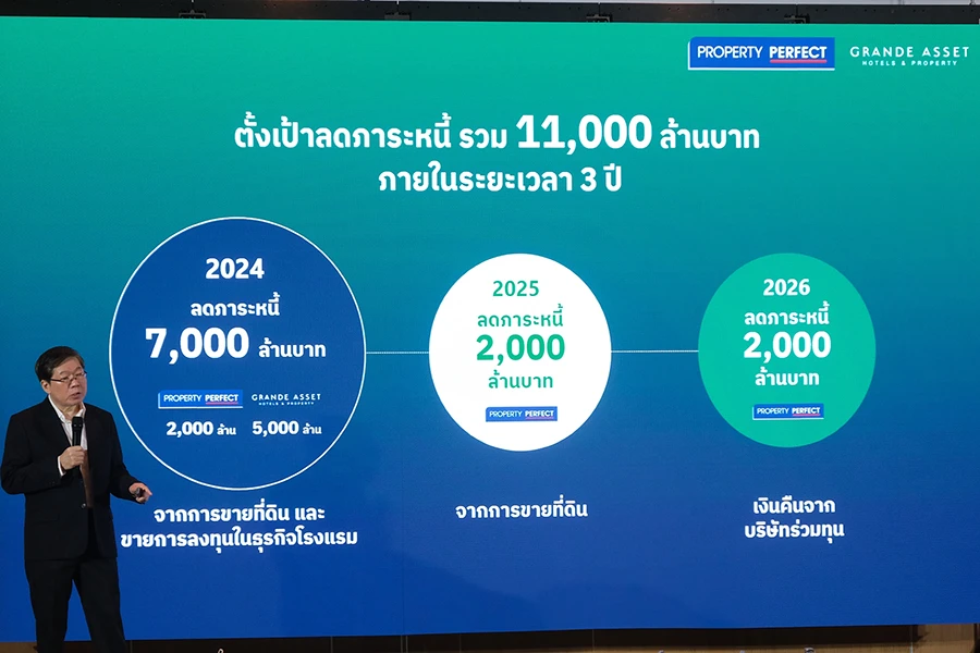 "ปีนี้กลุ่มบริษัทยังมีนโยบายสร้างความมั่นคงด้านการเงิน ให้ความสำคัญกับการลดภาระหนี้มากกว่าการขยายตัว ตั้งเป้าลดอัตราส่วนหนี้สินต่อทุนของกลุ่มบริษัทให้ลงไปอยู่ที่ระดับ 1 เท่าภายในสิ้นปีนี้ โดยปีนี้มีแผนลดภาระหนี้ของ พร็อพเพอร์ตี้ เพอร์เฟค 2,000 ล้านบาท แกรนด์ แอสเสทฯ 5,000 ล้านบาท รวมเป็น 7,000 ล้านบาท จากการขายที่ดินและขายการลงทุนในธุรกิจโรงแรม นอกจากนี้ยังมีแผนลดภาระหนี้ของพร็อพเพอร์ตี้ เพอร์เฟค ใน 2 ปีข้างหน้าอีกปีละ 2,000 ล้านบาท จากการขายที่ดินและเงินคืนจากบริษัทร่วมทุน ซึ่งจะทำให้กลุ่มบริษัทสามารถลดภาระหนี้ลงรวม 11,000 ล้านบาท ภายในระยะเวลา 3 ปี"
