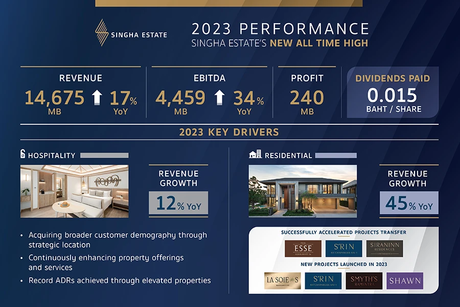 นางฐิติมา รุ่งขวัญศิริโรจน์ ประธานเจ้าหน้าที่บริหาร บริษัท สิงห์ เอสเตท จำกัด (มหาชน) หรือ 'S' เปิดเผยว่า "จากความมุ่งมั่นในการดำเนินธุรกิจที่เป็นเลิศ ความสำเร็จของการพัฒนาโครงการอสังหาฯ และการปรับปรุงประสิทธิภาพของ Portfolio อย่างเข้มข้นในปีที่ผ่านมา ส่งผลให้ในปี 2566 บริษัทฯ บันทึกรายได้ในระดับสูงที่สุดเป็นประวัติการณ์ ควบคู่กับการคุมต้นทุนต่างๆ ให้มีประสิทธิภาพเหมาะสมกับช่วงการขยายธุรกิจและเปิดตลาดใหม่ ส่งผลให้เรามีผลกำไรสุทธิในปี จำนวน 240 ล้านบาท ด้วยความพร้อมทางการเงินและประสบการณ์ที่จะขยายธุรกิจให้เติบโตอย่างยั่งยืนและให้เป็นไปตามแผนธุรกิจที่วางไว้ รวมถึงการเดินหน้าสร้างผลประกอบการที่แข็งแกร่ง เพื่อสร้างผลตอบแทนที่ดีอย่างต่อเนื่องให้กับทุกภาคส่วนที่เกี่ยวข้อง โดยในปีนี้ เราประกาศจ่ายปันผลการดำเนินงานดังกล่าวเป็นเครื่องยืนยันความสำเร็จจากการปรับตัวทางธุรกิจ ทำให้เราสามารถช่วงชิงโอกาสได้ทันกับการฟื้นตัวของธุรกิจที่พักอาศัยและโรงแรม ทั้งนี้ บริษัทฯ เห็นสัญญาณการเติบโตของธุรกิจที่ชัดเจนในช่วงไตรมาส 4 ปี 2566 ต่อเนื่องมาจนถึงช่วงต้นปีนี้ เราจึงเชื่อมั่นว่าแรงส่งจากการตอบรับที่ดีของตลาดต่อผลิตภัณฑ์ของสิงห์ เอสเตท ผนวกกับพัฒนาการสำคัญต่างๆ ที่เราได้สร้างไว้ในปี 2566 นี้ จะเป็นแหล่งรายได้สำคัญให้กับผลประกอบการในปี 2567 โดยอธิบายได้ตามหมวดธุรกิจ ดังนี้