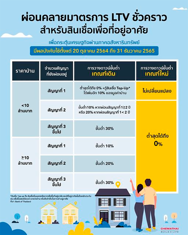เกณณ์การผ่อนคลายมาตรการ LTV ชั่วคราวสำหรับสินเชื่อเพื่อที่อยู่อาศัย มีผลบังคับใช้ตั้งแต่ 20 ตุลาคม 2564 ถึง 31 ธันวาคม 2565