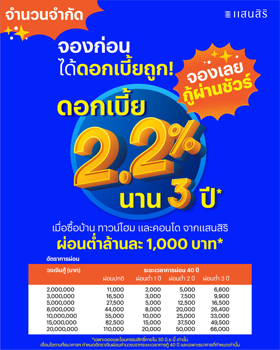 ในโครงการต่าง ๆ ของแสนสิริที่ครอบคลุมทั้งในกรุงเทพฯ และต่างจังหวัดทุกระดับราคาและความต้องการ รวมถึงบริการหลังการขาย หรือ Sansiri Service ส่งผลให้มีผู้ที่สนใจเข้าเยี่ยมชมโครงการที่อยู่อาศัยต่างๆ ของแสนสิริจำนวนมากและประสบความสำเร็จด้านยอดขาย ทั้งนี้ ล่าสุด แสนสิริยังได้ชูอัตราดอกเบี้ยที่ดีที่สุดในตลาดอสังหาฯ พร้อมเป็นรายแรกและรายเดียว ที่ให้อัตราดอกเบี้ยต่ำที่สุดในขณะนี้ด้วยอัตราดอกเบี้ยเพียง 2.2% เทียบกับอัตราดอกเบี้ยสินเชื่อที่อยู่อาศัยใหม่ เฉลี่ยอยู่ที่ 2.6 – 3.97% หรือภาพรวมอัตราดอกเบี้ยที่อยู่อาศัยอยู่ที่อัตราเฉลี่ยราว 3% ขณะที่อัตราดอกเบี้ยที่อยู่อาศัยมีแนวโน้มที่จะสูงขึ้นสอดคล้องกับภาวะเงินเฟ้อที่ส่งผลต่อต้นทุนวัสดุก่อสร้างและราคาที่อยู่อาศัยในอนาคต โดยแสนสิริ มอบดอกเบี้ยพิเศษ 2.2% นานสูงสุด 3 ปี* (จำนวนจำกัด) หรือผ่อนต่ำล้านละ 1,000 บาท* เริ่มเพียงเดือนละ 2,000 บาท* ในบ้าน ทาวน์โฮม คอนโดมิเนียม พร้อมอยู่จากแสนสิริรวม 69 โครงการทั่วประเทศ ตั้งแต่ระดับราคา 2 - 30 ล้านบาท พร้อมข้อเสนอพิเศษ ที่ทุกโครงการ พร้อมโอกาสสุดท้าย! บ้านเดี่ยว ทาวน์โฮม ลดเลยไม่ต้องลุ้น ลดเพิ่มทันทีสูงสุด 100,000 บาท คอนโดมิเนียม ฟรีส่วนกลางสูงสุด 5 ปี พร้อมอัตราดอกเบี้ยดี ถึง 30 เมษายนนี้ นอกจากนี้ แสนสิริจะรุกการตลาดภายใต้กลยุทธ์ "YOU Are Made For Life" อย่างต่อเนื่อง โดยเตรียมเปิดตัวแคมเปญการตลาดไตรมาส 2 ที่น่าสนใจเร็วๆ นี้ ตอบรับความมุ่งมั่นของแสนสิริในการสนับสนุนให้คนไทยมีบ้านได้ง่ายขึ้น ทั้งนี้ จากความสำเร็จตั้งแต่ไตรมาสแรกทำให้เชื่อมั่นจะสามารถสร้างผลงานยอดขาย – ยอดโอนได้ 35,000 ล้านบาท ตามเป้าหมายที่วางไว้” นายอุทัย กล่าว