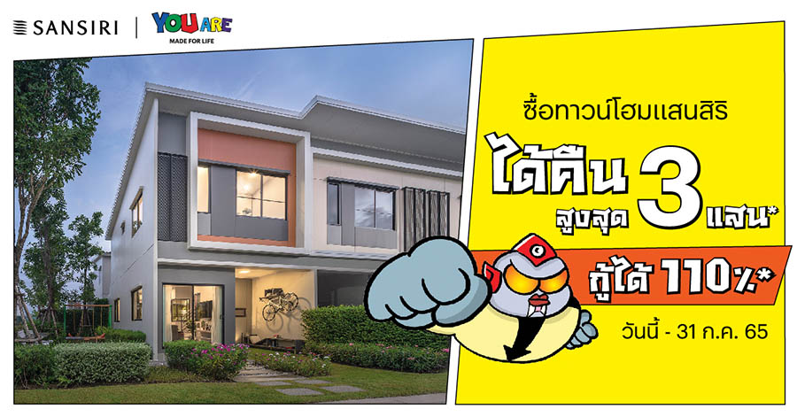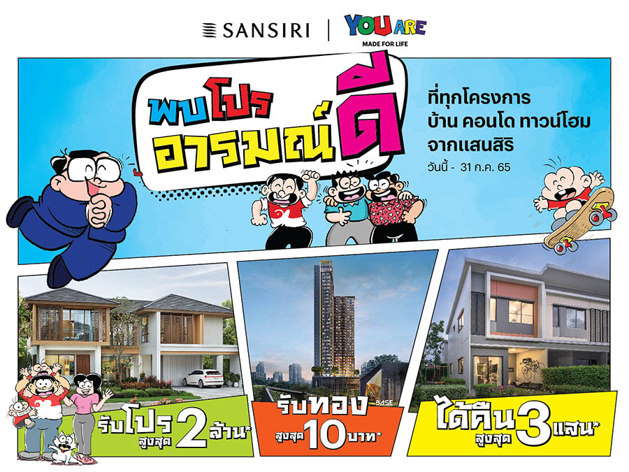 พบกับ “โปรอารมณ์ดี” ที่จะทำให้คนไทยทั้งประเทศอารมณ์ดีม้ากมาก…หัวเราะดังขึ้น รับดอกเบี้ยเรทดีที่สุดจากธนาคารอย่างไม่เคยมีมาก่อนในวงการอสังหา 2.2% นานสูงสุด 3 ปี* หรือผ่อนแค่ล้านละ 1,000 บาทต่อเดือน* พร้อมจัดเต็มดีลที่ดีที่สุดจากทั้ง 66 โครงการ เริ่ม 1.39 ล้านบาท บ้านเดี่ยว ดีลดีสูงสุด 2 ล้าน* คอนโดมิเนียม รับทองทันทีสูงสุด 10 บาท* และทาวน์โฮม ได้คืนสูงสุด 3 แสน* กู้ได้ 110 %* ตั้งแต่วันนี้ถึง 31 ก.ค.65 นี้