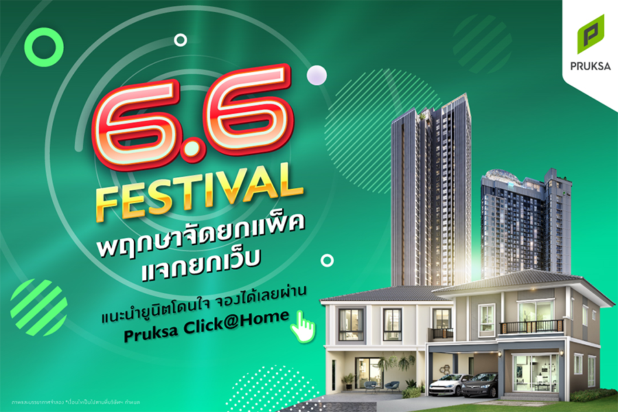 6.6 Festival พฤกษาจัดยกแพ็ค แจกยกเว็บ ยกดีลเด็ดให้ช้อปได้ยกเว็บ!! ทั้งบ้านเดี่ยว ทาวน์โฮม คอนโดจากพฤกษา พบยูนิตโดนใจ จองได้เลยผ่าน Pruksa Click@Home เลือกง่าย จองง่าย จ่ายง่าย 3 Step เพื่อการ #ซื้อบ้านที่บ้าน ตลอด 24 ชั่วโมง