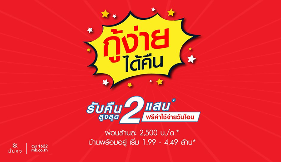 มั่นคงฯ จัดแคมเปญสุดพิเศษ กู้ง่ายได้คืน สูงสุด 200,000 บ.* ผ่อนสบาย ล้านละ 2,500 บ./ด.* นาน 2 ปี พร้อมโปรโมชั่นจัดเต็มทุกโครงการ ทั้งบ้านเดี่ยว บ้านแฝด และทาวน์โฮม พร้อมอยู่ในราคาพิเศษ เริ่ม 1.99 - 4.49 ล้าน โปรโมชั่นตั้งแต่ 1-30 มิ.ย.65