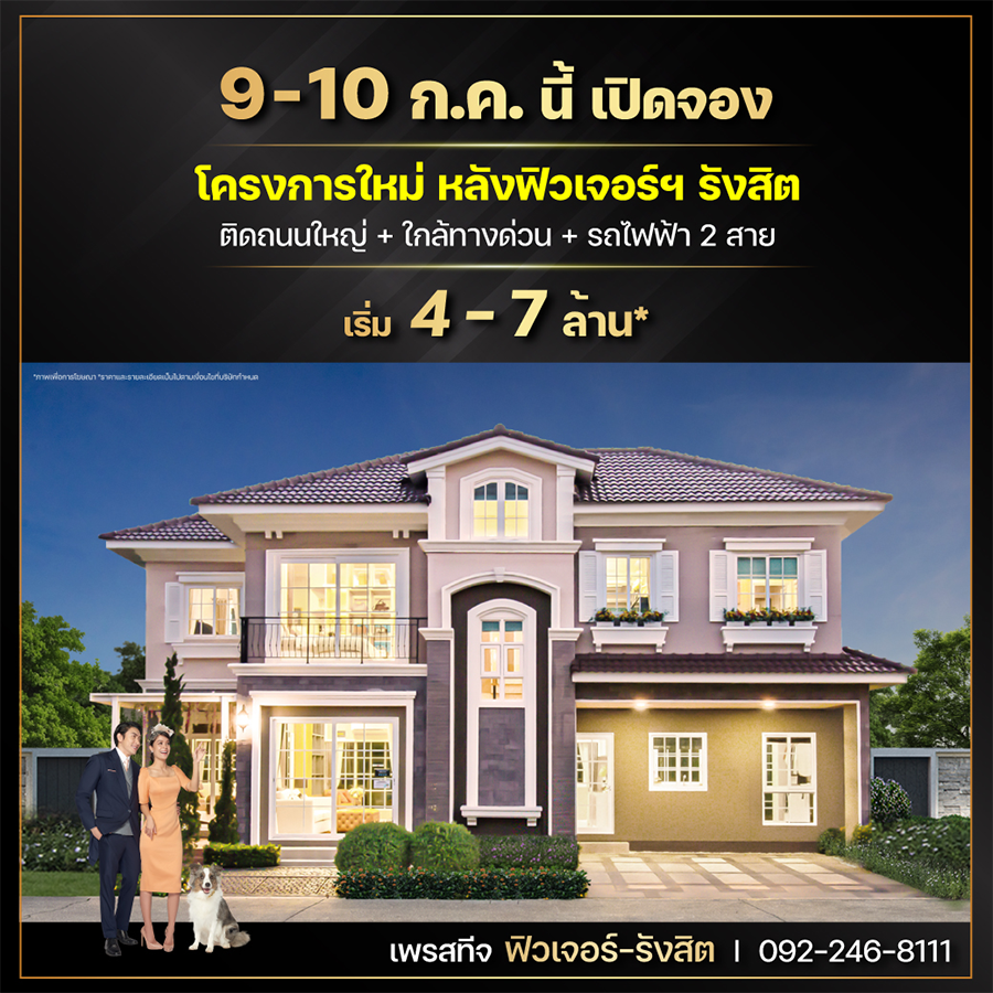 9 - 10 ก.ค. นี้ เปิดจอง โครงการใหม่หลังฟิวเจอร์ รังสิต "เพรสทีจ ฟิวเจอร์ - รังสิต" บ้านหลังใหญ่ 4 ห้องนอน ฟังก์ชั่นครบครัน สไตล์อังกฤษ ติดถนนใหญ่ ใกล้ทางด่วน และ รถไฟฟ้า 2 สาย อลังการสโมสรส่วนกลาง สิ่งอำนวยความสะดวกครบครัน จองในวันงาน รับส่วนลดสูงสุดกว่า 600,000* สอบถามข้อมูลเพิ่มเติม โทร. 092-246-8111