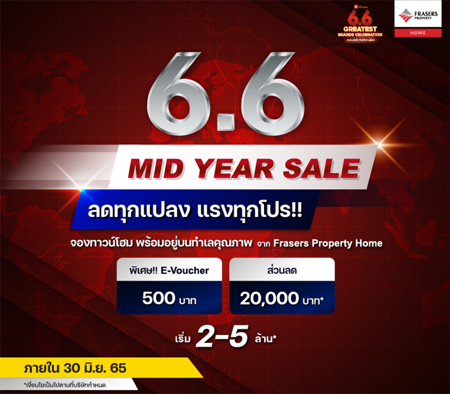 6.6 MID YEAR SALE เพียงซื้อ E-Voucher 500 บาท* ผ่าน Shopee รับส่วนลดสุดคุ้ม 20,000 บาท* สำหรับทาวน์โฮมพร้อมอยู่ ทำเลคุณภาพทั่วไทยจาก Frasers Property Home