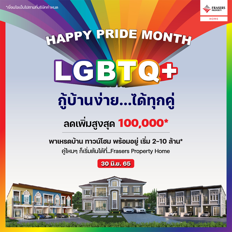เฟรเซอร์ส พร็อพเพอร์ตี้ "HAPPY PRICE MONT" ฉลองเดือนแห่งPRICE MONT ยกขบวนพาเหรดบ้าน และทาวน์โฮม พร้อมอยู่ ทั่วไทย มอบสิทธิพิเศษ LGBTQ+ กู้บ้านง่าย...ได้ทุกคู่* รับส่วนลดเพิ่มสูงสุดมูลค่า 100,000 บาท เริ่ม 2-10 ล้าน* ระยะเวลาโปรโมชั่น วันนี้ - 30 มิ.ย. 65 (*เฉพาะแปลง และโครงการที่เข้าร่วมโปรโมชั่น)