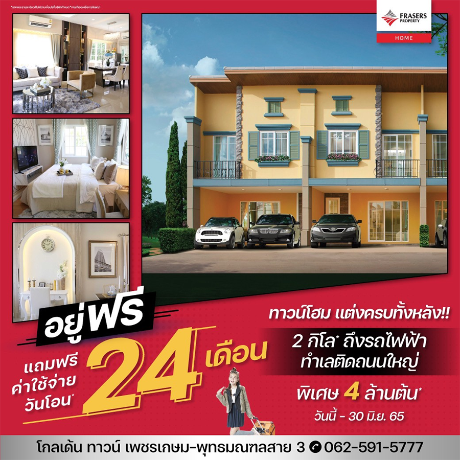 *เงื่อนไขและโปรโมชันเป็นไปตามที่บริษัทฯ กำหนด รายการของแถมอาจแตกต่างไปตามเงื่อนไขของแต่ละโครงการ และขอสงวนสิทธิ์ในการเปลี่ยนแปลงโดยมิต้องแจ้งให้ทราบล่วงหน้า / *อัตราผ่อนเป็นไปตามที่ธนาคารกำหนด โปรโมชันนี้จองและโอนภายใน มิ.ย. 2565