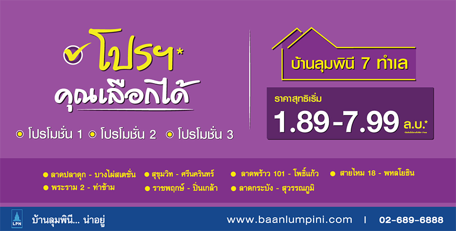 • LPN จัดแคมเปญ "โปรฯ คุณเลือกได้" กับบ้านลุมพินี 7 ทำเล ราคาสุทธิเริ่มต้น 1.89 - 7.99 ล้านบาท โอกาสแบบนี้มีมาไม่บ่อย