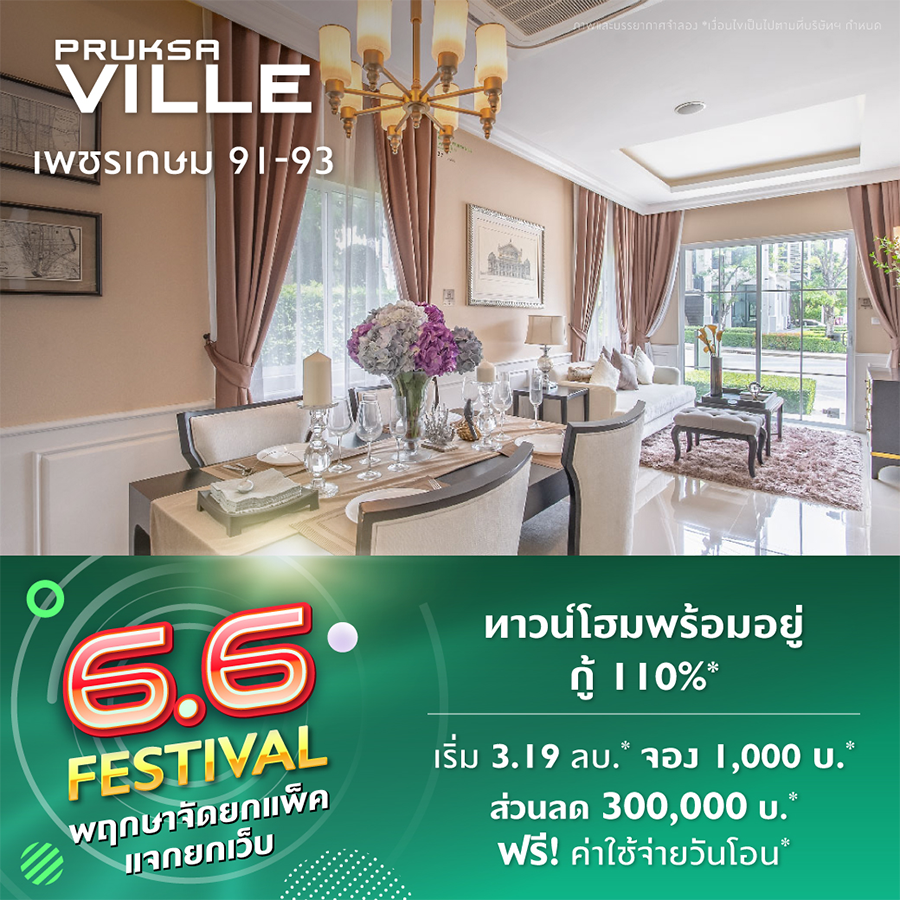 บริษัทพฤกษา เรียลเอสเตท จำกัด (มหาชน) จัดแคมเปญพิเศษ "6.6 Festival" พฤกษาจัดยกแพ็ค แจกยกเว็บ ยกดีลเด็ดให้ช้อปได้ยกเว็บ ทั้งบ้านเดี่ยว ทาวน์โฮม คอนโดจากพฤกษา พบยูนิตโดนใจ จองได้เลยผ่าน Pruksa Click@Home เลือกง่าย จองง่าย จ่ายง่าย 3 Step เพื่อการ #ซื้อบ้านที่บ้าน ตลอด 24 ชั่วโมง