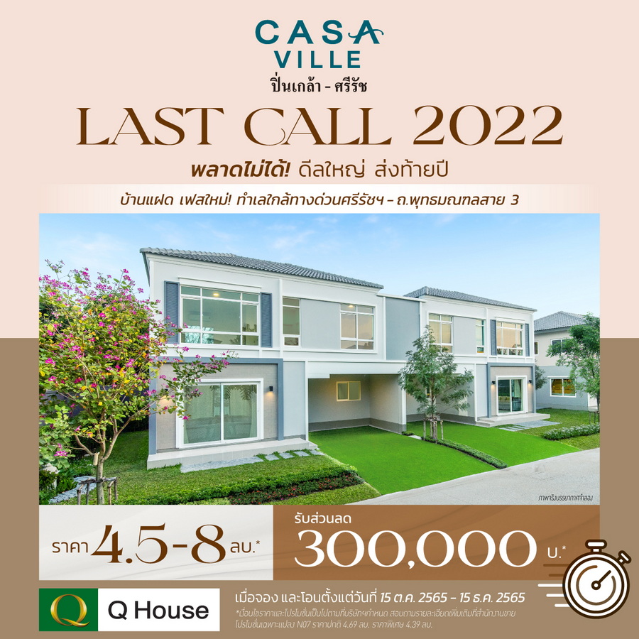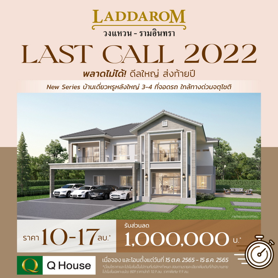 (*เงื่อนไขราคาและโปรโมชั่น "LAST CALL 2022" เฉพาะแปลง เฉพาะโครงการที่เข้าร่วมแคมเปญ รายการโปรโมชั่นนี้อาจเปลี่ยนแปลงได้โดยไม่ต้องแจ้งให้ลูกค้าทราบล่วงหน้าและเป็นไปตามเงื่อนไขที่บริษัทฯกำหนด)