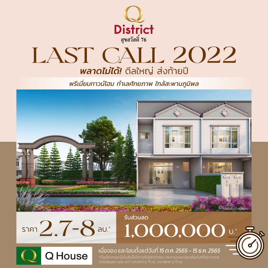 บริษัท ควอลิตี้เฮ้าส์ จำกัด (มหาชน) ผู้พัฒนาอสังหาริมทรัพย์ชั้นนำ เปิดเผยว่า ล่าสุดได้เปิดตัว โปรโมชั่นแคมเปญ "LAST CALL 2022" เพื่อมอบสิทธิพิเศษกับดีลยิ่งใหญ่แห่งปี มอบส่วนลดมูลค่า 200,000 - 1,000,000 บาท* ให้กับลูกค้าที่จองโครงการบ้านพร้อมอยู่ บน 6 ทำเลศักยภาพ กับ 42 โครงการ ของบริษัทฯและบริษัทในเครือ ทั้งโครงการบ้านเดี่ยว บ้านแฝด และทาวน์โฮม ภายใต้แบรนด์ ควอลิตี้เฮ้าส์ คาซ่า เดอะทรัสต์ กัสโต้ ในเขตกรุงเทพฯ ปริมณฑล และ 3 หัวเมืองหลักต่างจังหวัด คือ เชียงใหม่ ระยอง และชลบุรี ราคา 2.2 – 25 ล้านบาท* เมื่อจองและโอนตั้งแต่ 15 ต.ค. 2565 – 15 ธ.ค. 2565 เท่านั้น