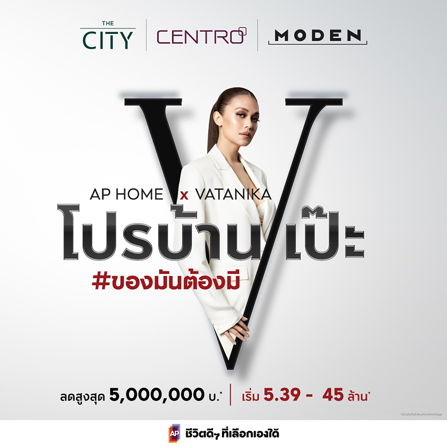 • พบกับแคมเปญ AP HOME x VATANIKA “โปรบ้านเป๊ะ” สำหรับลูกค้าที่จองและโอน บ้านเดี่ยวเอพี THE CITY, CENTRO และ MODEN รวมกว่า 40 โครงการ ครอบคลุมทุกทำเลทั่วกรุงเทพฯ เริ่มวันนี้ – 30 กันยายนนี้เท่านั้น ข้อมูลเพิ่มเติม https://apth.ly/aphome