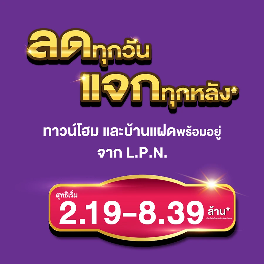 ห้ามพลาดกับโอกาสดีๆสำหรับคนอยากมีบ้านในแคมเปญ ‘ลดทุกวัน แจกทุกหลัง’* พบกับ 8 โครงการบ้านแฝดและทาวน์โฮมคุณภาพที่มาพร้อมกับความน่าอยู่จาก LPN พร้อมราคาสุดพิเศษ และรับของแถมมากมายมูลค่ารวมกว่า 2 ล้านบาท* เมื่อโอนฯ ตั้งแต่วันนี้ - 30 ก.ย. 66 (*เงื่อนไขเป็นไปตามที่บริษัทฯ กำหนด)  สำหรับผู้ที่สนใจสามารถเข้าชมโครงการได้ที่สำนักงานขายทั้ง 8 โครงการ ตั้งแต่เวลา 9.00 – 18.00 น. รายละเอียดเพิ่มเติมโทร LPN Call Center 02-689-6888 ช่องทางออนไลน์ www.baanlumpini.com / Facebook: Baan Lumpini l บ้านลุมพินี